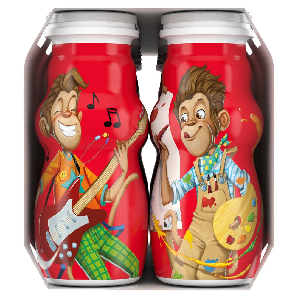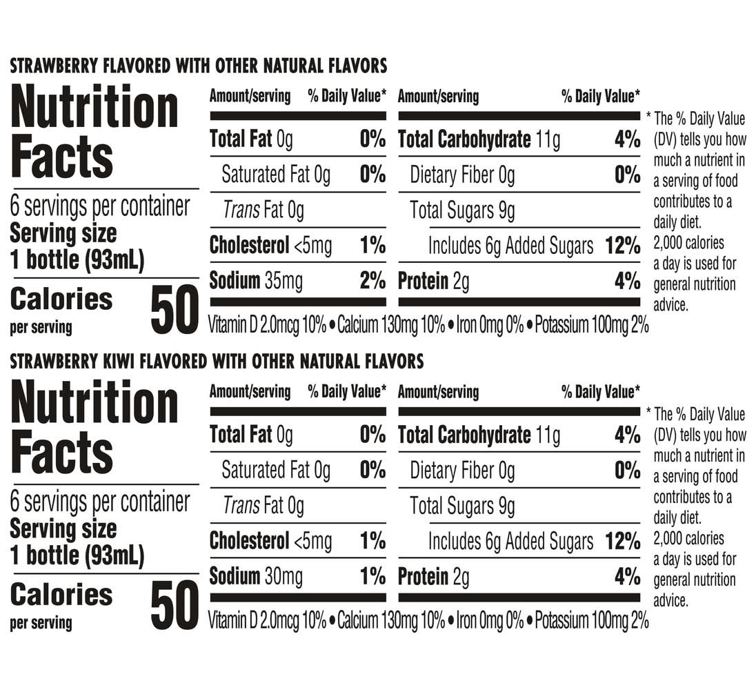 Ingredients: Strawberry Flavor: Strawberry Flavor Ingredients: Cultured Grade A Low Fat Milk Water Cane Sugar Food Starch, Contains Less than 1% of Natural Flavors Fruit & Vegetable Juice (for Color) Lemon Juice Concentrate Milk Minerals Vitamin D3. Strawberry Kiwi Flavor: Strawberry Kiwi Flavor Ingredients: Cultured Grade A Low Fat Milk Water Cane Sugar Food Starch Contains Less than 1% of Kiwi Puree, Contains Less than 1% of Kiwi Puree Natural Flavors Fruit & Vegetable Juice (for Color) Lemon Juice Concentrate Milk Minerals Vitamin D3. Contains: Milk
