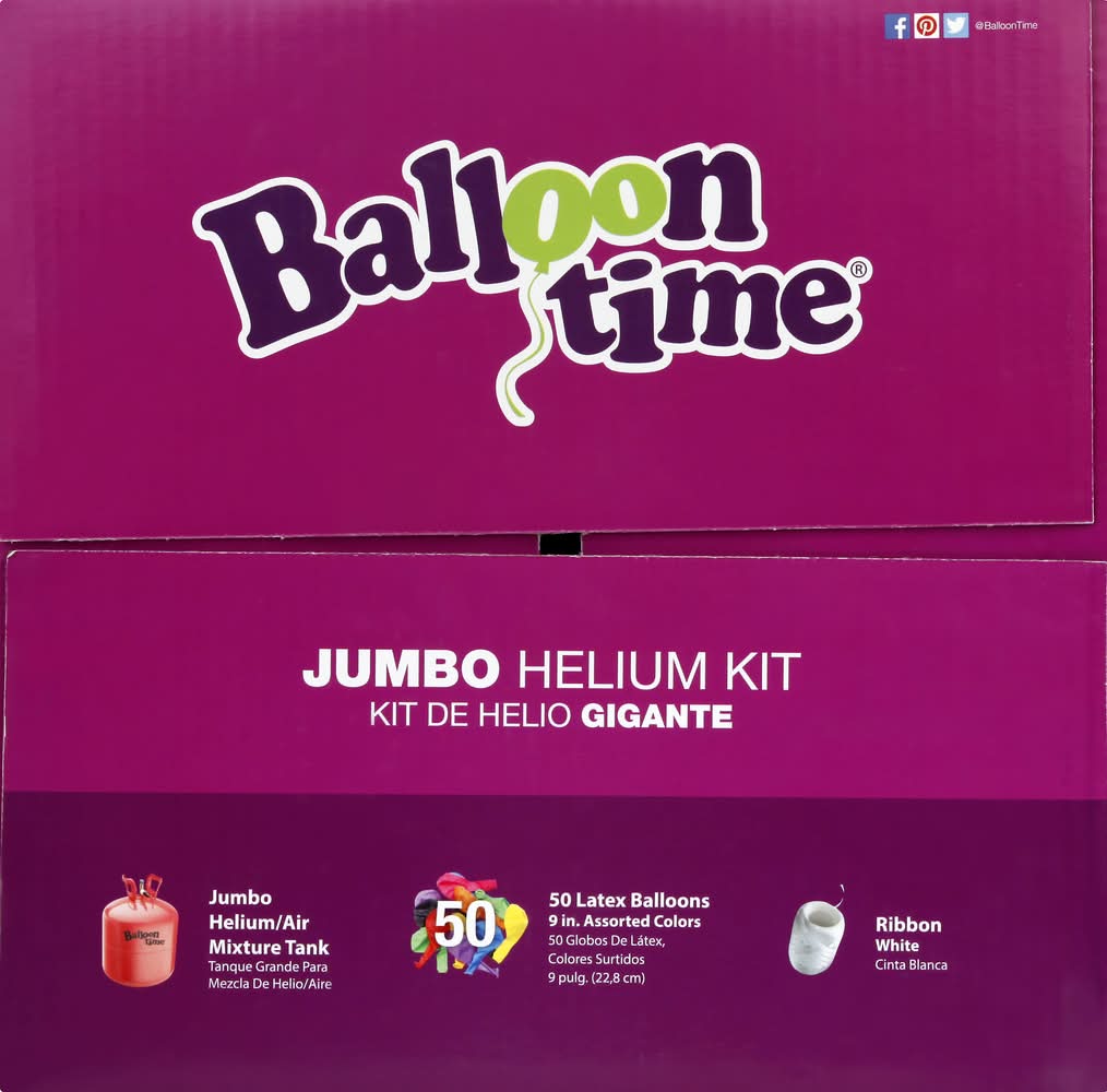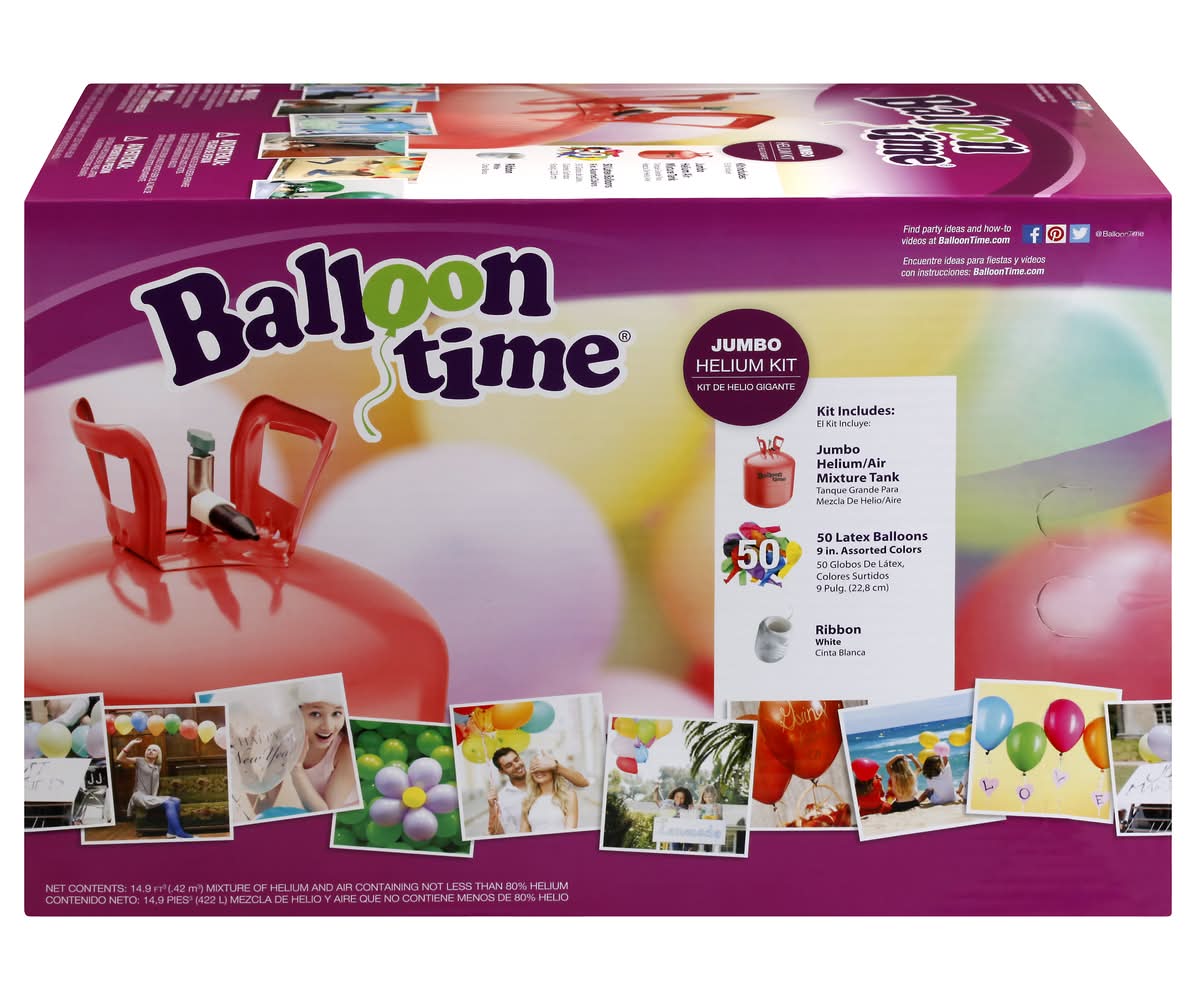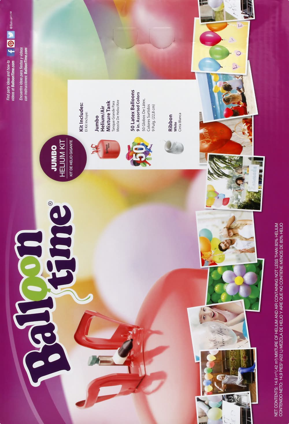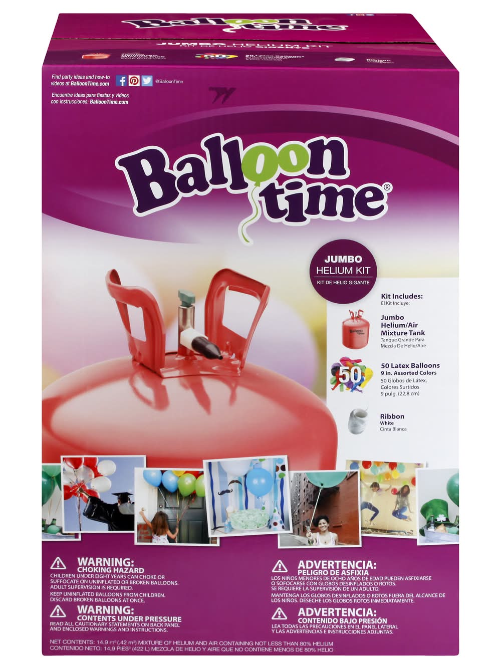 Kit Includes: Jumbo Helium/Air Mixture Tank; 50 Latex Balloons 9 in. Assorted Colors; Ribbon White. Properly sized 9 in. balloon shown for reference. Balloon Fill Guide: Jumbo tank will yield 45-50, 9 in. latex balloons. Larger balloons require more helium/air mixture, reducing the total number of balloons inflated. This cylinder contains a mixture of helium and air with not less than 80% helium. UN 1956 Compressed Gas, no.s (Helium, air) . Net Contents: 14.9 cu. ft (42 cu. m); Mixture of helium and air containing not less than 80% helium. Inside package complies with prescribed specifications. This product is made from 25% recycled steel and 40% corrugated. For recycling and disposal instructions. Curbside pick-up may be available in your area. Contact your local waste authority. Note: Please respect the environment. Do not release balloons outdoors in free flight. Made in USA with global components. • Worthington Cylinder, Columbus, OH, 43085 • Packaging: Reusable