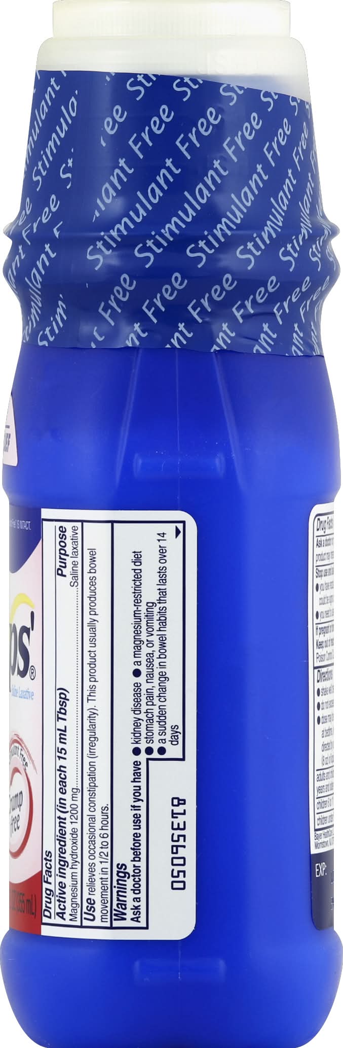 Ingredients: In Each 15 mL Active Ingredients: Magnesium Hydroxide (1200 mg), Saline Laxative. Inactive Ingredients: Anhydrous Citric Acid, Carboxymethylcellulose Sodium, D&C Red 28, Flavor, Glycerin, Microcrystalline Cellulose, Purified Water, Sodium Citrate, Sodium Hypochlorite, Sucrose, Xanthan Gum Additives: Inactive Ingredients: Anhydrous Citric Acid, Carboxymethyl Cellulose Sodium, D&C Red No. 28, Flavor, Glycerin, Microcrystalline Cellulose, Purified Water, Sodium Citrate, Sodium Hypochlorite, Sucrose, Xanthan Gum.