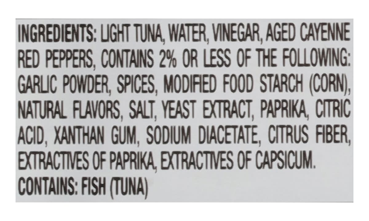 Ingredients: Light Tuna, Water, Vinegar, Aged Cayenne Red Peppers, Contains 2% or Less of the Following: Garlic Powder, Spices, Modified Food Starch (Corn), Natural Flavors, Salt, Yeast Extract, Paprika, Citric Acid, Xanthan Gum, Sodium Diacetate, Citrus Fiber, Extractives of Paprika, Extractives of Capsicum Contains: Fish, Tuna