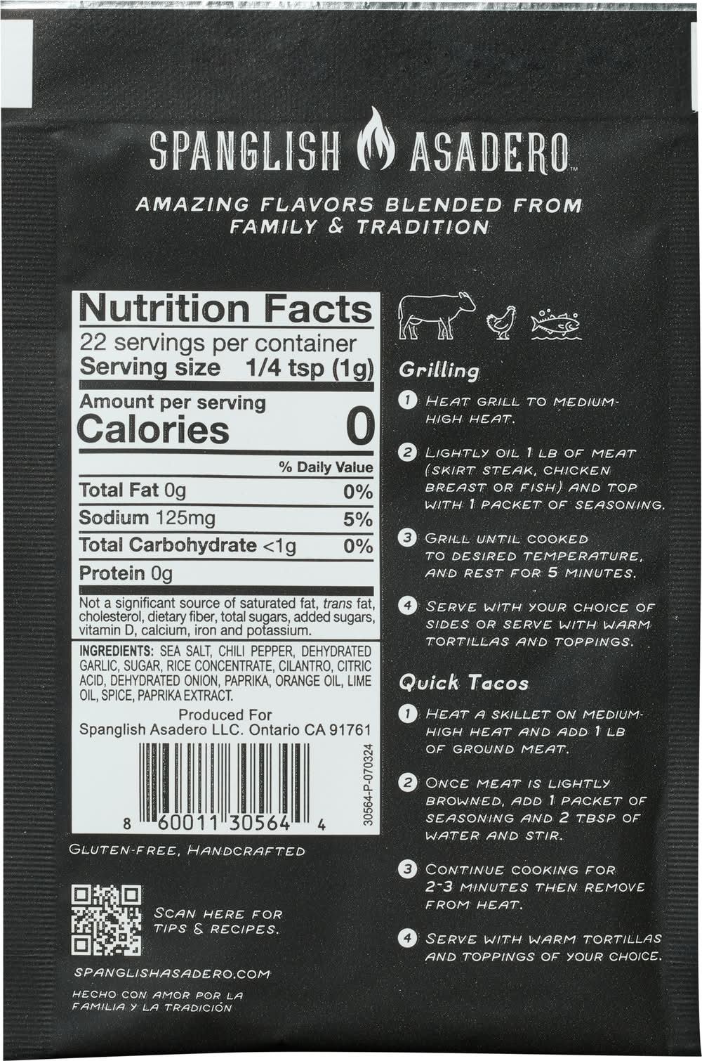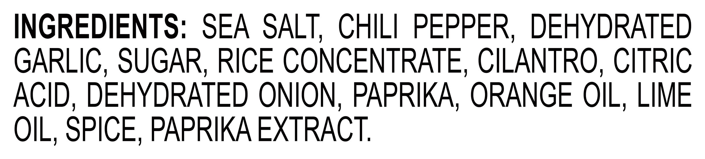 Ingredients: Sea Salt, Chili Pepper, Dehydrated Garlic, Sugar, Rice Concentrate, Cilantro, Citric Acid, Dehydrated Onion, Paprika, Orange Oil, Lime Oil, Spice, Paprika Extract