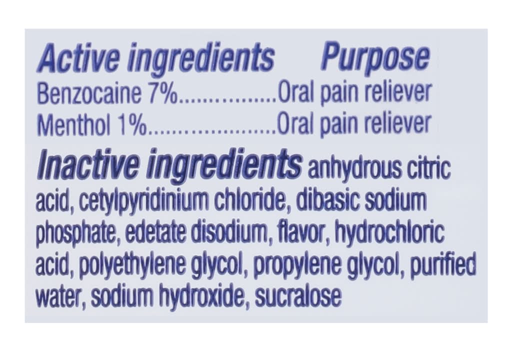 Ingredients: Active Ingredients: Benzocaine (7 %), Oral Pain Reliever; Menthol (1 %), Oral Pain Reliever. Inactive Ingredients: Anhydrous Citric Acid, Cetylpyridinium Chloride, Dibasic Sodium Phosphate, Edetate Disodium, Flavor, Hydrochloric Acid, Polyethylene Glycol, Propylene Glycol, Purified Water, Sodium Hydroxide, Sucralose Additives: Anhydrous Citric Acid, Cetylpyridinium Chloride, Dibasic Sodium Phosphate, Edetate Disodium, Flavor, Hydrochloric Acid, Polyethylene Glycol, Propylene Glycol, Purified Water, Sodium Hydroxide, Sucralose.