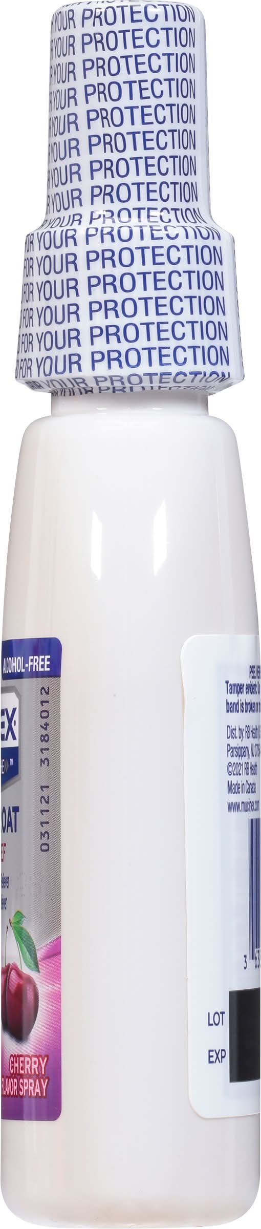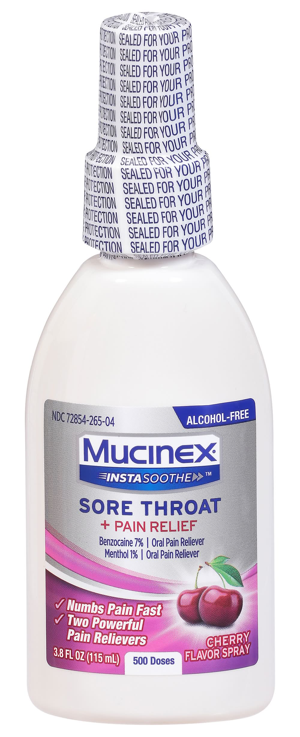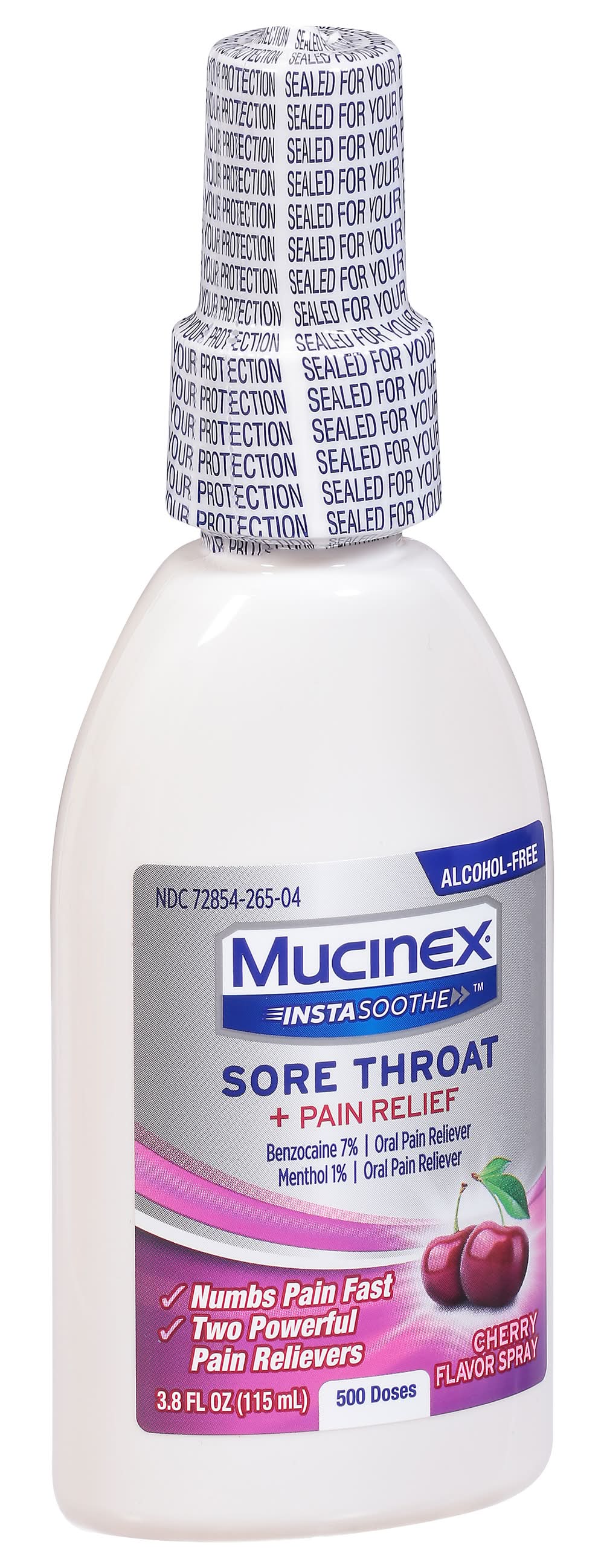 Introducing Mucinex® InstaSoothe Sore Throat + Pain Relief Spray. This Powerful sore throat relief with soothing cherry flavor is an easy-to-use spray that numbs pain fast so you can get back to your day. Our alcohol-free spray numbs pain fast and helps to relieve occasional minor irritation and pain associated with sore throat, sore mouth and canker sores. Powerful sore throat relief with soothing cherry flavor. Adults and children 12 years of age and over: Apply to affected area (one spray); gargle, swish around in the mouth, or allow to remain in place at least 1 minute then spit out. Use up to 4 times daily or as directed by a doctor. Children 6 to under 12 years of age: Supervise use. Children under 6 years of age: Do not use. RB Health (US), Parsippany NJ 07054-0224