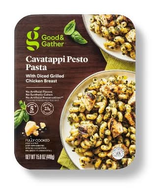 It's easy to enjoy a delicious dinner without having to cook it yourself with this Cavatappi Pesto Pasta with Chicken from Good & Gather™. Made with cavatappi pasta, tasty pesto sauce and diced grilled chicken breast, it can be served as is or topped with shaved Parmesan and herbs. Fully cooked and ready after just five minutes of heating, it's the perfect solution for nights when you simply don't have time to prepare a home-cooked dinner. Simply add a side salad and you have a delicious and satisfying lunch or dinner for the whole family.DirectionsKeep refrigerated until ready to use. Microwave1. Remove film. Cover with paper towel. 2. Microwave on HIGH for 2 minutes; stir and replace paper towel. 3. Microwave 1 1/2 to 2 1/2 minutes longer or until hot. Caution: Package and contents will be hot. Appliances may vary; adjust accordingly. Refrigerate or discard leftovers immediately. Every product that carries the Good & Gather™ name starts with quality ingredients that deliver great taste, making it easier for you and your family to eat well, every day. We promise you’ll love each bite, or your money back. All Good & Gather products are made without artificial flavors, synthetic colors, artificial sweeteners, and high-fructose corn syrup. Some are specially formulated while others never contained these ingredients.