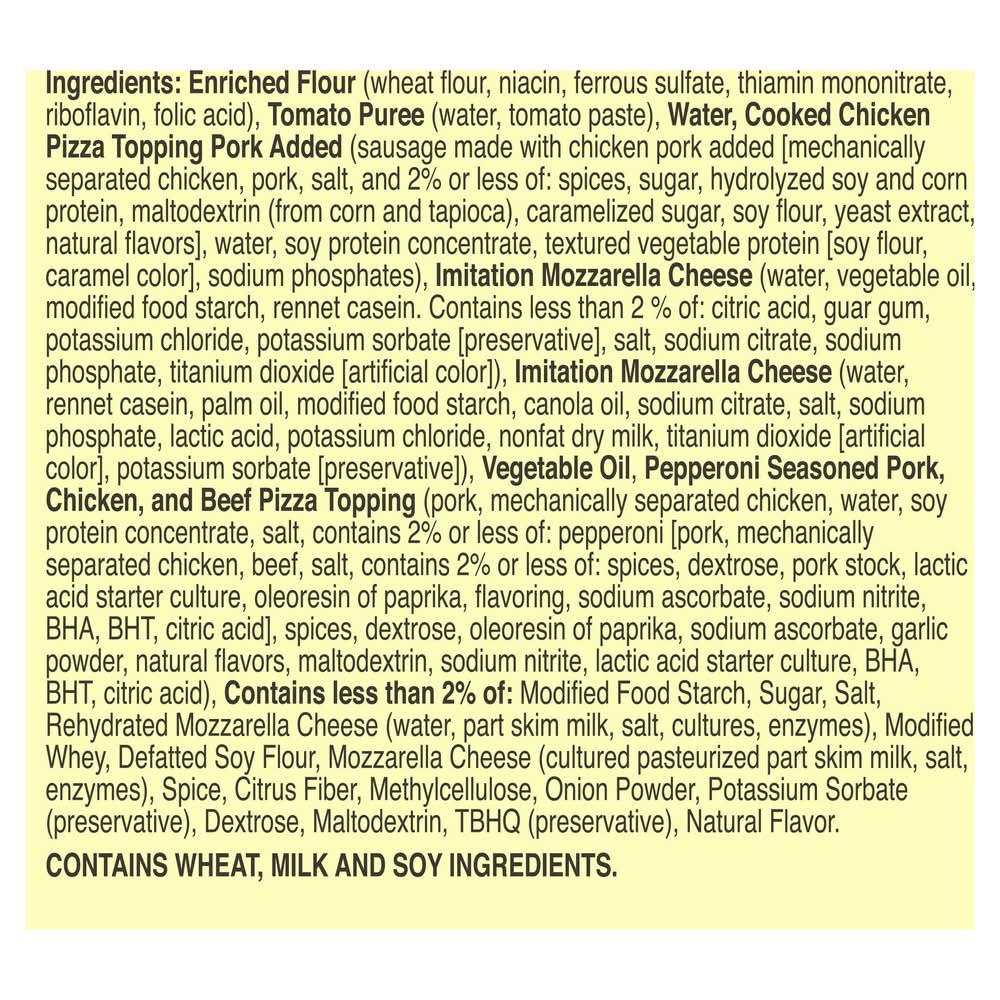 Ingredients: Enriched Flour Wheat Flour, Niacin, Ferrous Sulfate, Thiamin Mononitrate, Riboflavin, Folic Acid, Tomato Puree Water, Tomato Paste, Water, Cooked Chicken Pizza Topping Pork Added Sausage Made with Chicken Pork Added [Mechanically Separated Chicken, Pork, Salt, and 2% or Less of: Spices, Sugar, Hydrolyzed Soy and Corn Protein, Maltodextrin from Corn and Tapioca, Caramelized Sugar, Soy Flour, Yeast Extract, Natural Flavors], Water, Soy Protein Concentrate, Textured Vegetable Protein [Soy Flour, Caramel Color], Sodium Phosphates, Imitation Mozzarella Cheese Water, Palm Oil, Modified Corn Starch, Vegetable Oil, Rennet Casein, Salt, Sodium Aluminum Phosphate, Potassium Chloride, Citric Acid, Guar Gum, Potassium Sorbate [Preservative], Sodium Citrate, Sodium Phosphate, Titanium Dioxide Artificial Color], Vegetable Oil, Pepperoni Seasoned Pork, Chicken and Beef Pizza Topping Pork, Mechanically Separated Chicken, Water, Soy Protein Isolate, Beef, Salt, Contains 2% or Less of: Pepperoni [Pork, Mechanically Separated Chicken, Beef, Salt, Contains 2% or Less of: Spices, Dextrose, Pork Stock, Lactic Acid Starter Culture, Oleoresin of Paprika, Flavoring, Sodium Ascorbate, Sodium Nitrite, BHA, BHT, Citric Acid], Spices, Dextrose, Oleoresin of Paprika, Sodium Ascorbate, Garlic Powder, Natural Flavor, Maltodextrin, Sodium Nitrite, Lactic Acid Starter Culture, BHA, BHT, Citric Acid, Contains Less than 2% of: Modified Corn Starch, Rehydrated Fat Free Mozzarella Cheese Water, Skim Milk, Cheese Cultures, Salt, Enzymes, Citric Acid, Sugar, Salt, Modified Whey, Defatted Soy Flour, Dried Onion, Modified Tapioca Starch, Spice, Methylcellulose, Rehydrated Enzyme Modified Cheese Water, Milk, Cheese Cultures, Salt, Enzymes, Dextrose, Maltodextrin, TBHQ Preservative, Natural Flavor. Contains: wheat, milk, soybeans Additives: Genetically Modified Ingredients