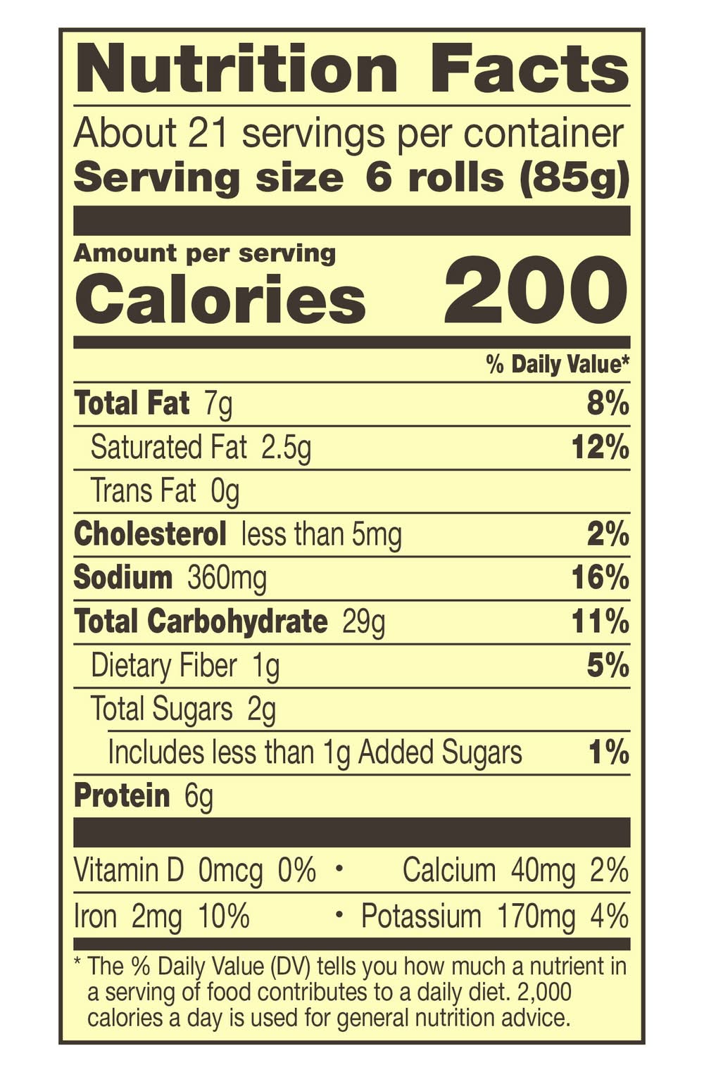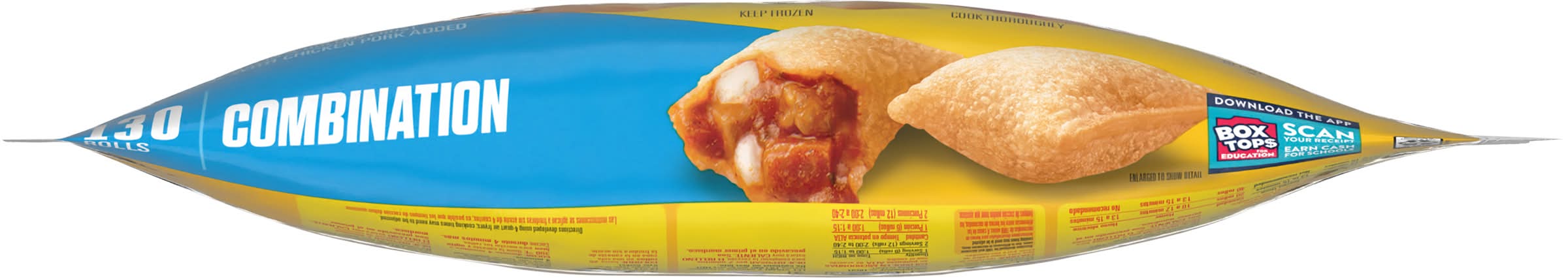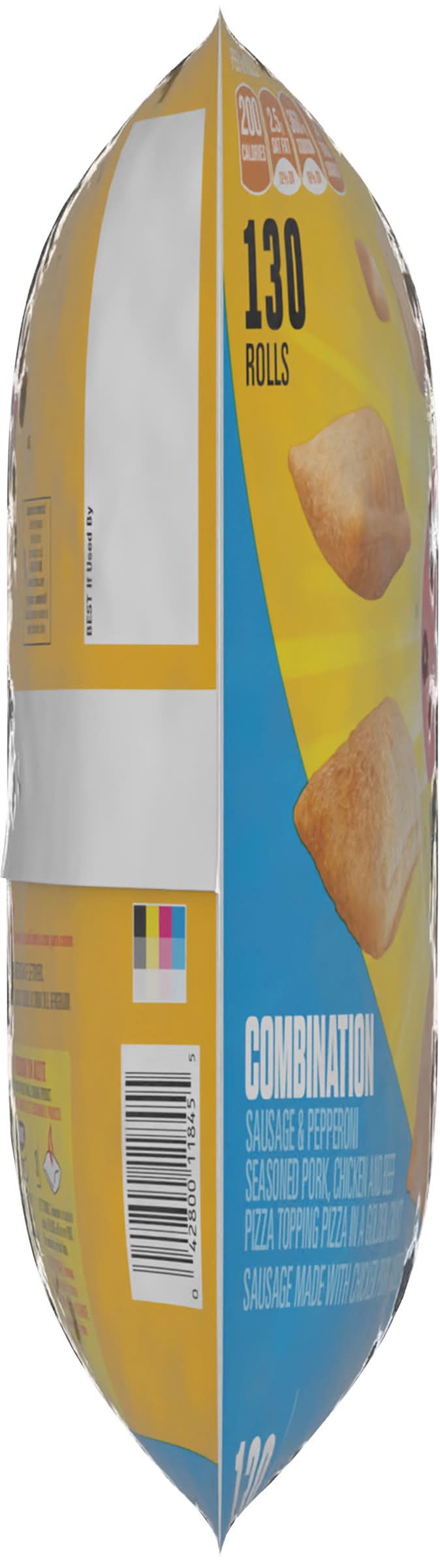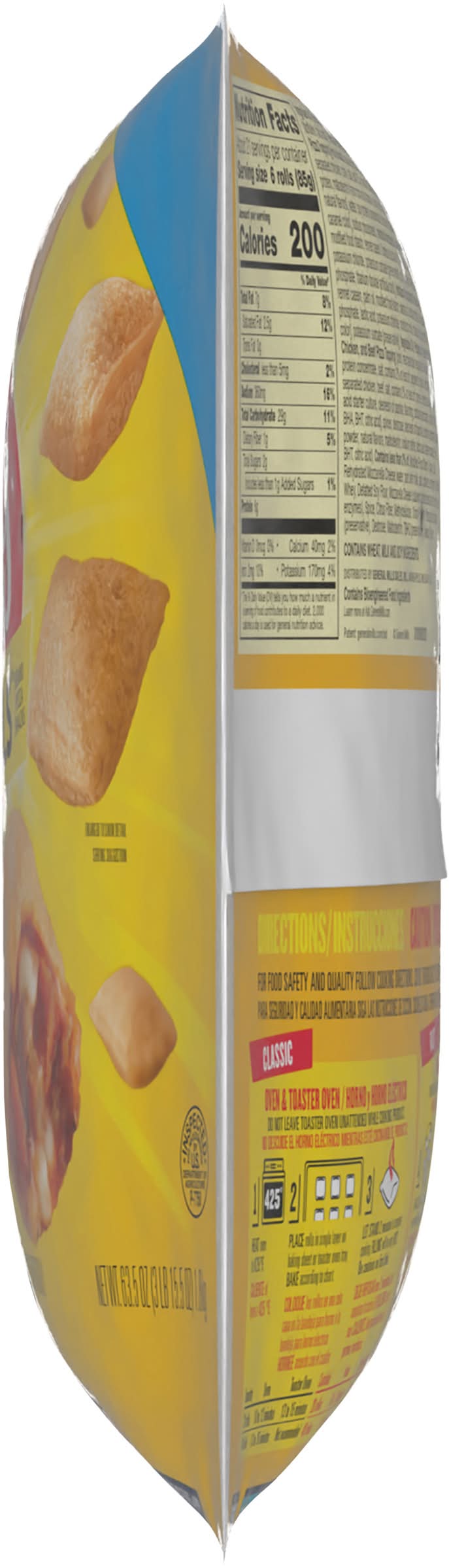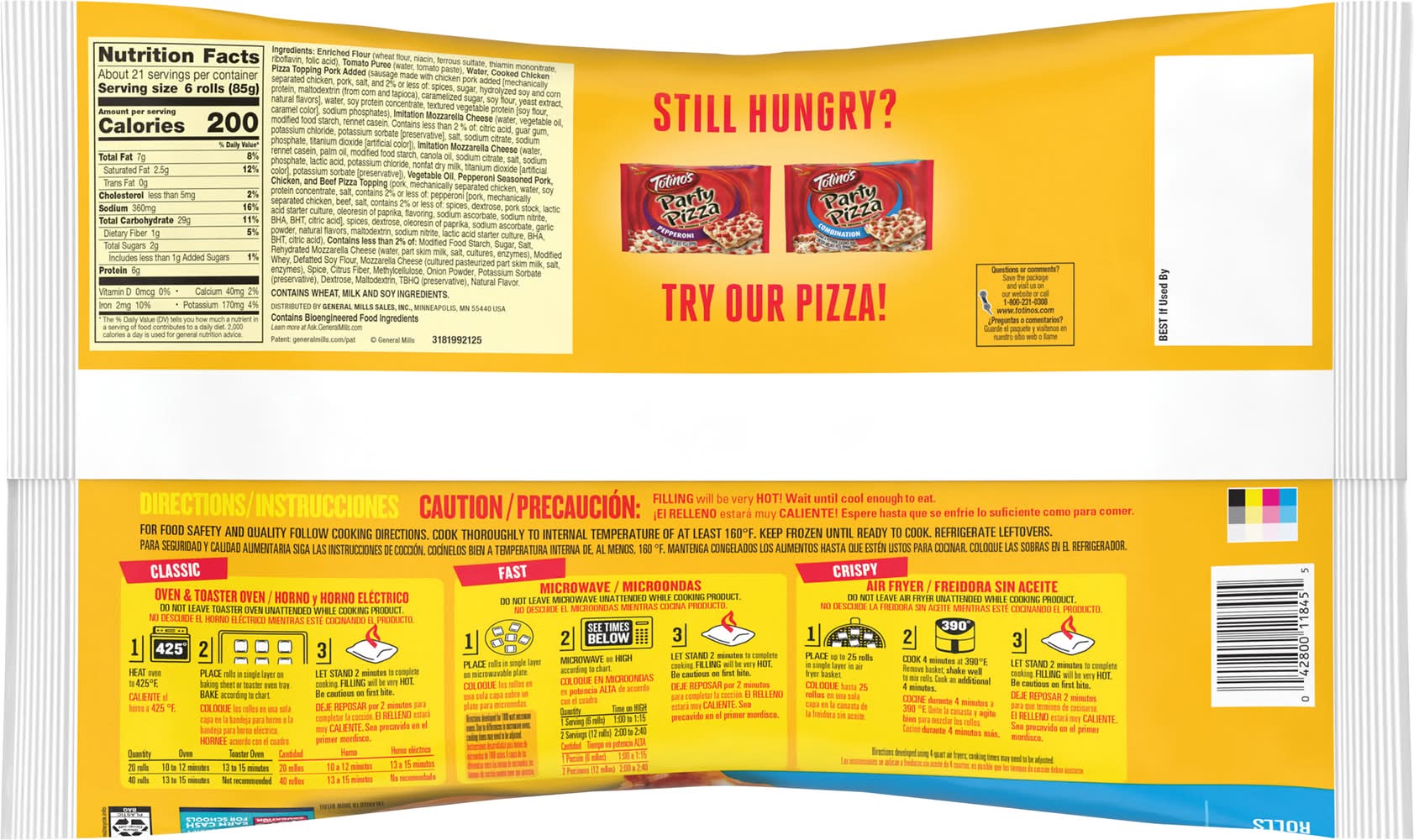 Pizza Rolls offer a convenient snack with a crispy exterior and a melted cheese interior, capturing the essence of classic cheese pizza in bite-sized portions. These snacks are easy to prepare, requiring only 60 seconds in the microwave or less than 10 minutes in an air fryer. Ideal for serving on their own or enhanced with additional pizza toppings and marinara dipping sauce, these pizza rolls provide a quick and tasty option for any occasion. • Number of servings: 21 • General Mills Sales, Minneapolis, MN, 55440, Ph: 800-949-9055 • Packaging: Reusable