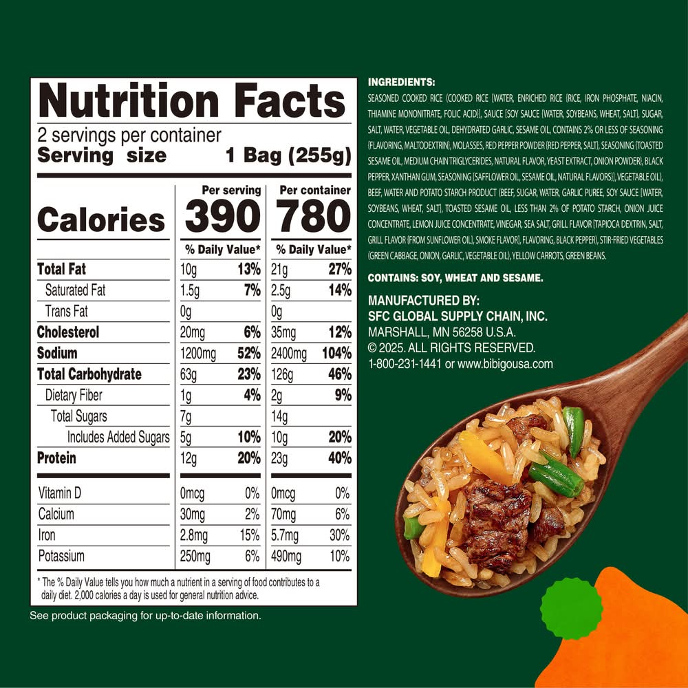 Ingredients: INGREDIENTS: SEASONED COOKED RICE (COOKED RICE [WATER, ENRICHED RICE {RICE, IRON PHOSPHATE, NIACIN, THIAMINE MONONITRATE, FOLIC ACID}], SAUCE [SOY SAUCE {WATER, SOYBEANS, WHEAT, SALT}, SUGAR, SALT, WATER, VEGETABLE OIL, DEHYDRATED GARLIC, SESAME OIL, CONTAINS 2% OR LESS OF SEASONING {FLAVORING, MALTODEXTRIN}, MOLASSES, RED PEPPER POWDER {RED PEPPER, SALT}, SEASONING {TOASTED SESAME OIL, MEDIUM CHAIN TRIGLYCERIDES, NATURAL FLAVOR, YEAST EXTRACT, ONION POWDER}, BLACK PEPPER, XANTHAN GUM, SEASONING {SAFFLOWER OIL, SESAME OIL, NATURAL FLAVORS}], VEGETABLE OIL), BEEF, WATER AND POTATO STARCH PRODUCT (BEEF, SUGAR, WATER, GARLIC PUREE, SOY SAUCE [WATER, SOYBEANS, WHEAT, SALT], TOASTED SESAME OIL, LESS THAN 2% OF POTATO STARCH, ONION JUICE CONCENTRATE, LEMON JUICE CONCENTRATE, VINEGAR, SEA SALT, GRILL FLAVOR [TAPIOCA DEXTRIN, SALT, GRILL FLAVOR {FROM SUNFLOWER OIL}, SMOKE FLAVOR], FLAVORING, BLACK PEPPER), STIR-FRIED VEGETABLES (GREEN CABBAGE, ONION, GARLIC, VEGETABLE OIL), YELLOW CARROTS, GREEN BEANS. Contains: Wheat, Soy, Sesame