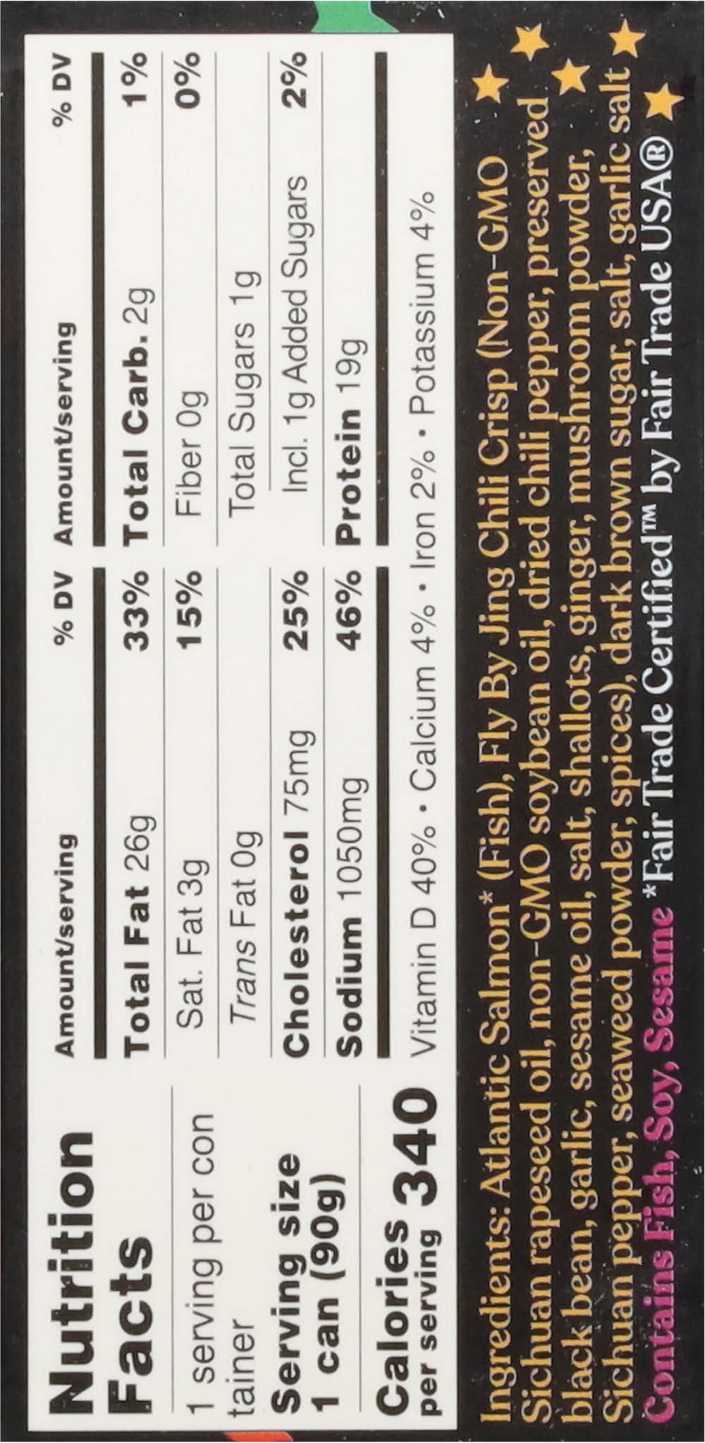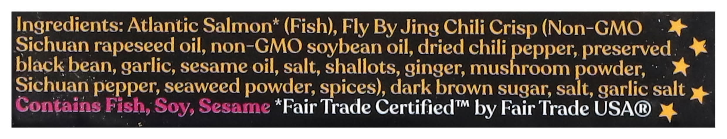 Ingredients: Atlantic Salmon (Fair Trade Certified by Fair Trade USA) (Fish), Fly by Jing Chili Crisp (Non-GMO Sichuan Rapeseed Oil, Non-GMO Soybean Oil, Dried Chili Pepper, Preserved Black Bean, Garlic, Sesame Oil, Salt, Shallots, Ginger, Mushroom Powder, Sichuan Pepper, Seaweed Powder, Spices), Dark Brown Sugar, Salt, Garlic Salt Contains: Crustacean Shellfish, Fish, Salmon, Sesame, Soybeans, Fish