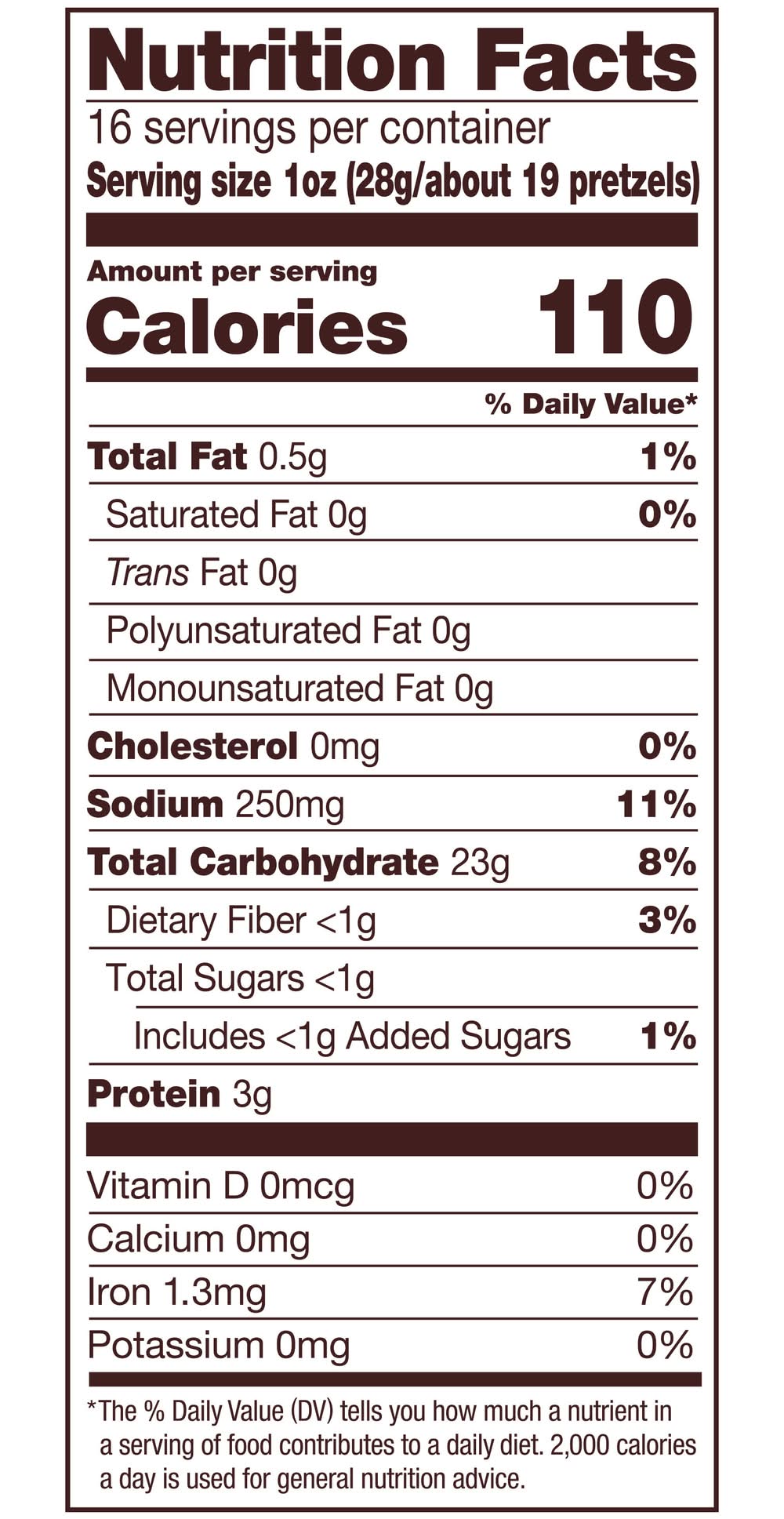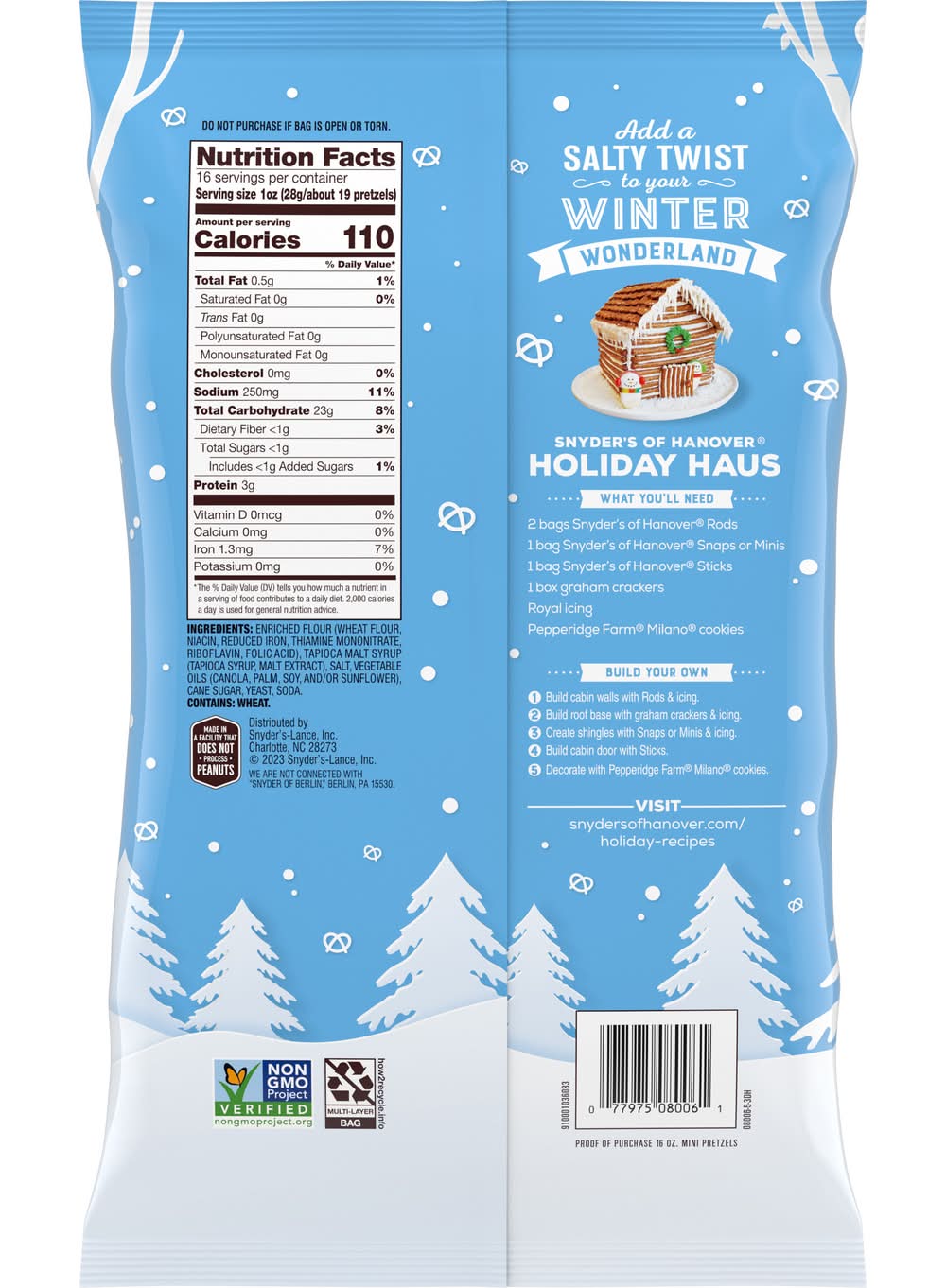 Snyder's of Hanover Mini Pretzels give you that delicious crunch for a perfectly sized snack. Our Mini Pretzels offer all the delicious flavor of traditional pretzels in a crunchy, bite-size snack. They're perfect for snacking at home or on-the-go! Made in a facility that does not process peanuts, they're the perfect school snack. Snyder's of Hanover has been America's Pretzel Bakery since 1909, making pretzels from wholesome ingredients, kneaded and oven-baked to seal in the flavor. Snyder's of Hanover pretzels have been shared across tables, across generations and across the country, making us America's favorite pretzel brand. Our pretzels give you that delicious crunch for the perfect snack!