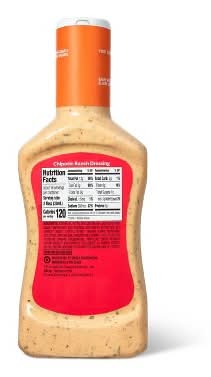 Add bold flavor to an array of dishes with Chipotle Ranch Dressing from market pantry™. The creaminess of classic ranch salad dressing is balanced out by tangy, smoky and spicy chipotle flavor — all with no certified synthetic colors and no MSG added— for a delicious condiment. The 16-ounce bottle provides you plenty to use over several occasions, and it has a convenient twist-on lid that makes it easy to keep fresh whatever you don't use. Great on a southwest-inspired salad, on tacos or nachos, or as a marinade for chicken or beef, this chipotle ranch is a dressing you'll reach for again and again. Flavor: Spicy