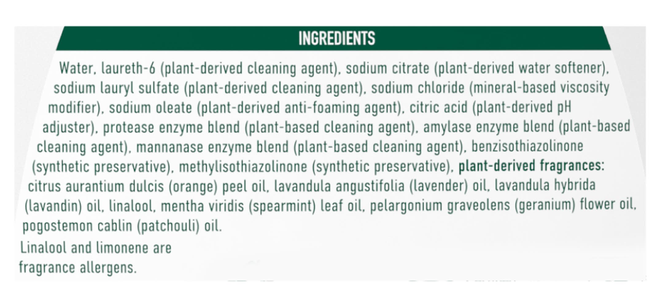 Ingredients: Water, Laureth-6 (Plant-Derived Cleaning Agent), Sodium Citrate (Plant-Derived Water Softener), Sodium Lauryl Sulfate (Plant-Derived Cleaning Agent), Sodium Chloride (Mineral-Based Viscosity Modifier), Sodium Oleate (Plant-Derived Anti-Foaming Agent), Citric Acid (Plant-Derived pH Adjuster), Protease Enzyme Blend (Plant-Based Cleaning Agent), Amylase Enzyme Blend (Plant-Based Cleaning Agent), Mannanase Enzyme Blend (Plant-Based Cleaning Agent), Benzisothiazolinone (Synthetic Preservative), Methylisothiazolinone (Synthetic Preservative), Plant-Derived Fragrances: Citrus Aurantium Dulcis (Orange) Peel Oil, Lavandula Angustifolia (Lavender) Oil, Lavandula Hybrida (Lavandin) Oil, Linalool, Mentha Viridis (Spearmint) Leaf Oil, Pelargonium Graveolens (Geranium) Flower Oil, Pogostemon Cablin (Patchouli) Oil