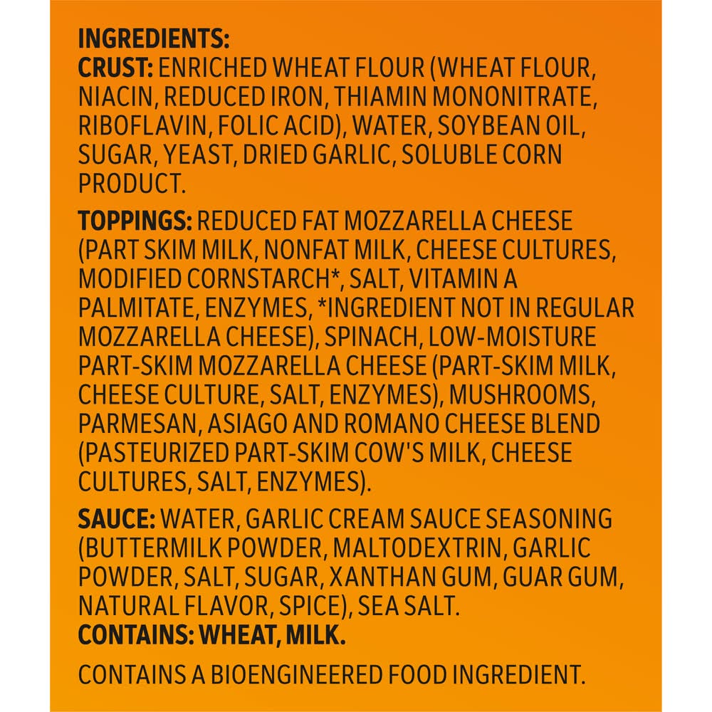 Ingredients: CRUST: ENRICHED WHEAT FLOUR (WHEAT FLOUR, NIACIN, REDUCED IRON, THIAMIN MONONITRATE, RIBOFLAVIN, FOLIC ACID), WATER, SOYBEAN OIL, SUGAR, YEAST, DRIED GARLIC, SOLUBLE CORN PRODUCT. TOPPINGS: REDUCED FAT MOZZARELLA CHEESE (PART SKIM MILK, NONFAT MILK, CHEESE CULTURES, MODIFIED CORNSTARCH*, SALT, VITAMIN A PALMITATE, ENZYMES, *INGREDIENT NOT IN REGULAR MOZZARELLA CHEESE), SPINACH, LOW-MOISTURE PART-SKIM MOZZARELLA CHEESE (PART-SKIM MILK, CHEESE CULTURE, SALT, ENZYMES), MUSHROOMS, PARMESAN, ASIAGO AND ROMANO CHEESE BLEND (PASTEURIZED PART-SKIM COW'S MILK, CHEESE CULTURES, SALT, ENZYMES), . SAUCE: WATER, GARLIC CREAM SAUCE SEASONING (BUTTERMILK POWDER, MALTODEXTRIN, GARLIC POWDER, SALT, SUGAR, XANTHAN GUM, GUAR GUM, NATURAL FLAVOR, SPICE), SEA SALT. Contains: CONTAINS: WHEAT, MILK.