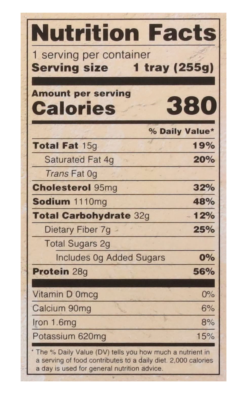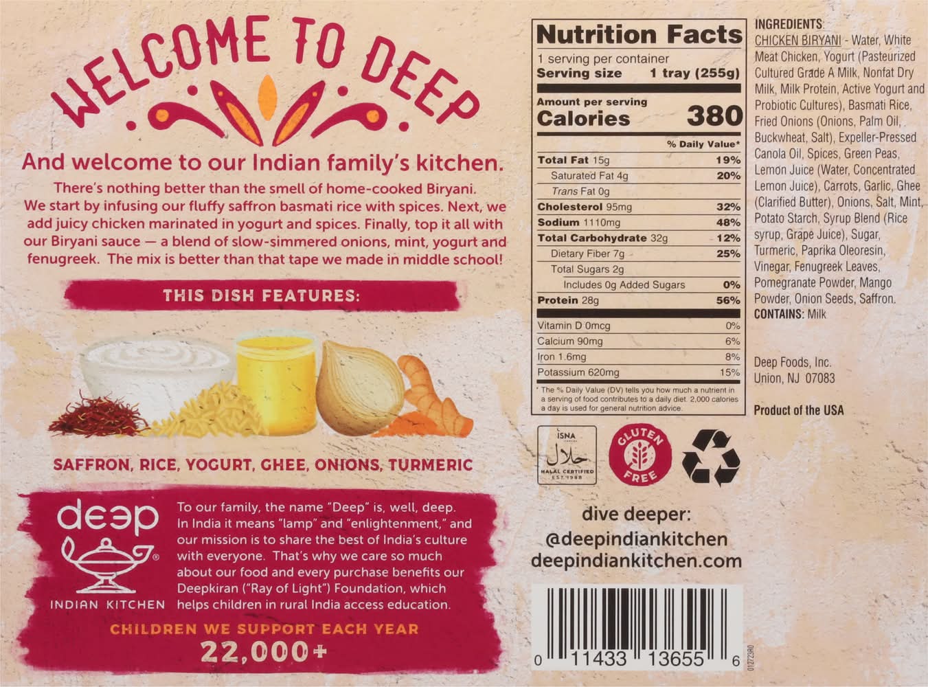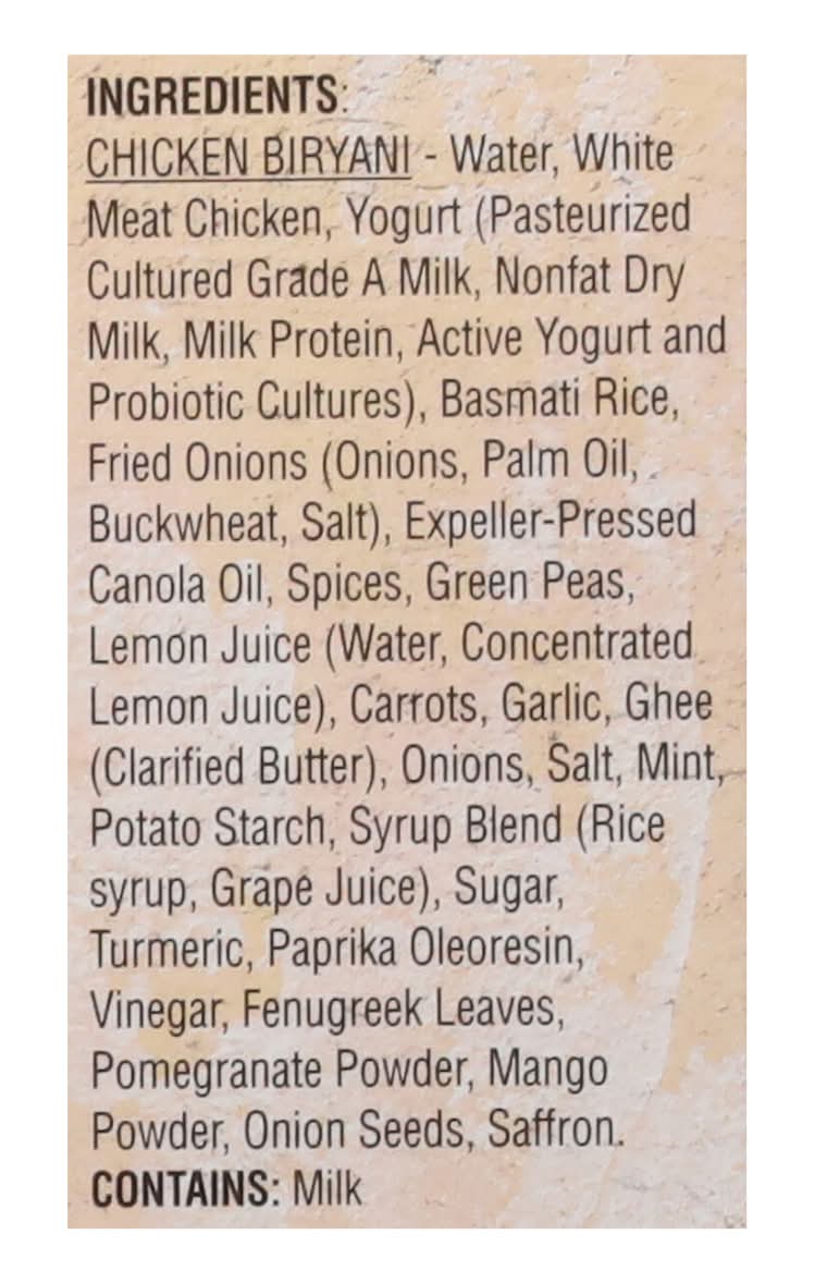 Ingredients: Chicken Biryani - Water, White Meat Chicken, Yogurt (Pasteurized Cultured Grade A Milk, Nonfat Dry Milk, Milk Protein, Active Yogurt and Probiotic Cultures), Basmati Rice, Fried Onions (Onions, Palm Oil, Buckwheat, Salt), Expeller-Pressed Canola Oil, Spices, Green Peas, Lemon Juice (Water, Concentrated Lemon Juice), Carrots, Garlic, Ghee (Clarified Butter), Onions, Salt, Mint, Potato Starch, Syrup Blend (Rice Syrup, Grape Juice), Sugar, Turmeric, Paprika Oleoresin, Vinegar, Fenugreek Leaves, Pomegranate Powder, Mango Powder, Onion Seeds, Saffron Contains: Milk, Wheat