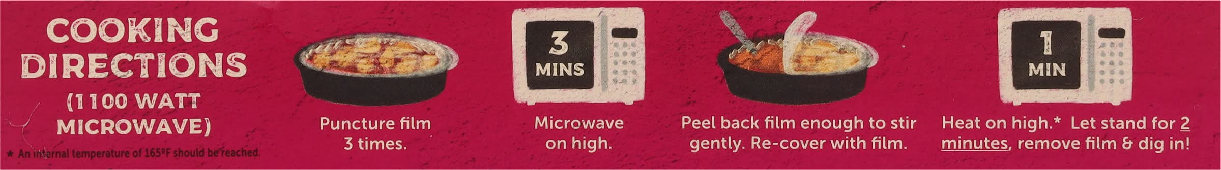 Directions for use: Directions: Cooking Directions (1100 Watt Microwave): Puncture film 3 times. Microwave on high. Peel back film enough to stir gently. Re-cover with film. Heat on high. Let stand for 2 minutes, remove film & dig in! An internal temperature of 165 degrees F should be reached. For a complete experience, pair with our: Chicken Tikka Samosas & Garlic Naan. Keep frozen. Storage recommendation: Keep frozen.