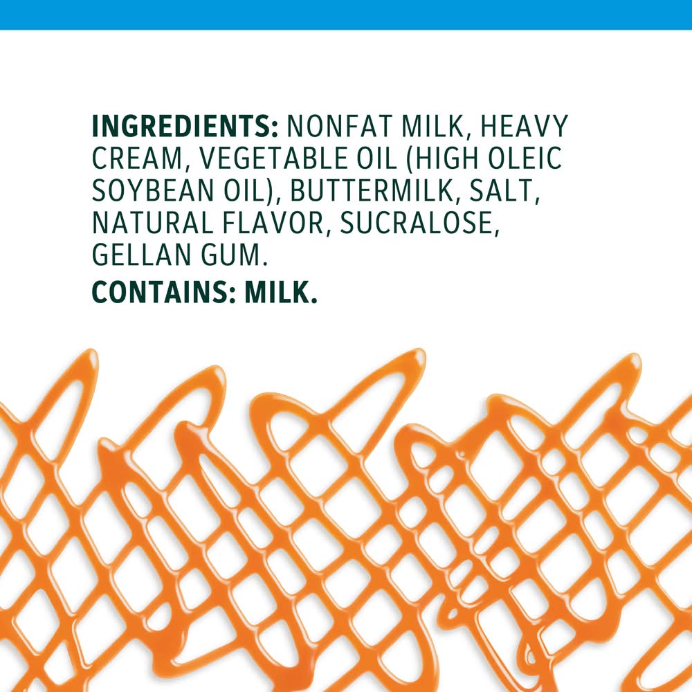 Ingredients: NONFAT MILK, HEAVY CREAM, VEGETABLE OIL (HIGH OLEIC SOYBEAN OIL), BUTTERMILK, SALT, NATURAL FLAVOR, SUCRALOSE, GELLAN GUM. Contains: Milk