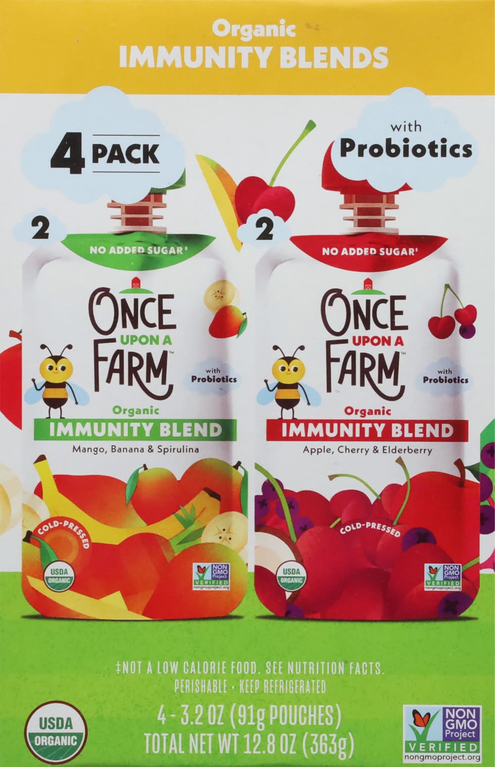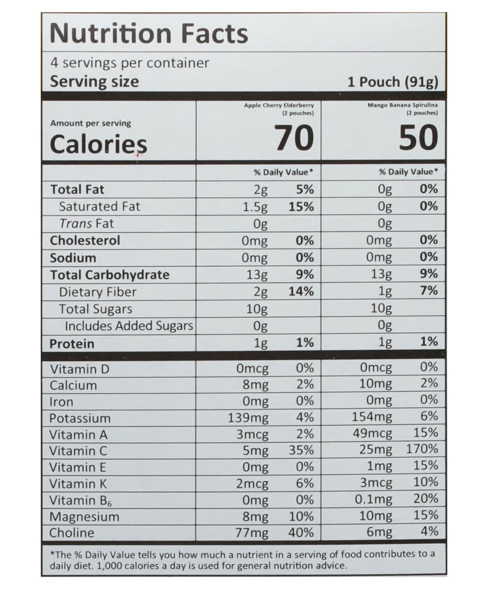 2 - Mango, Banana & Spirulina. 2 - Apple, Cherry & Elderberry. Apple Cherry Elderberry (2 pouches): USDA Organic. Mango Banana Spirulina (2 pouches): USDA Organic. No added sugar (Not a low calorie food. See nutrition facts). Apple Cherry Elderberry (2 pouches): Non-GMO Project verified. nongmoproject.org. Mango Banana Spirulina (2 pouches): Non-GMO Project verified. nongmoproject.org. Probiotics to help support immune health! (When paired with a healthy diet and active lifestyle). Cold-pressured protected to lock in nutrients. No preservatives or concentrates. Flavor: Mango-banana-spirulina-apple-cherry-elderberry