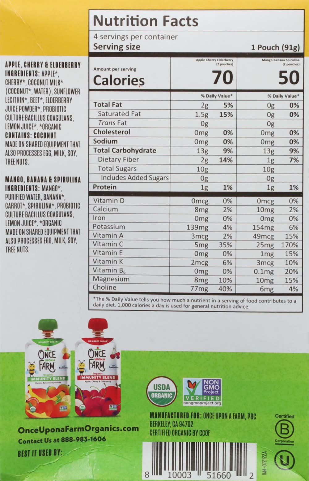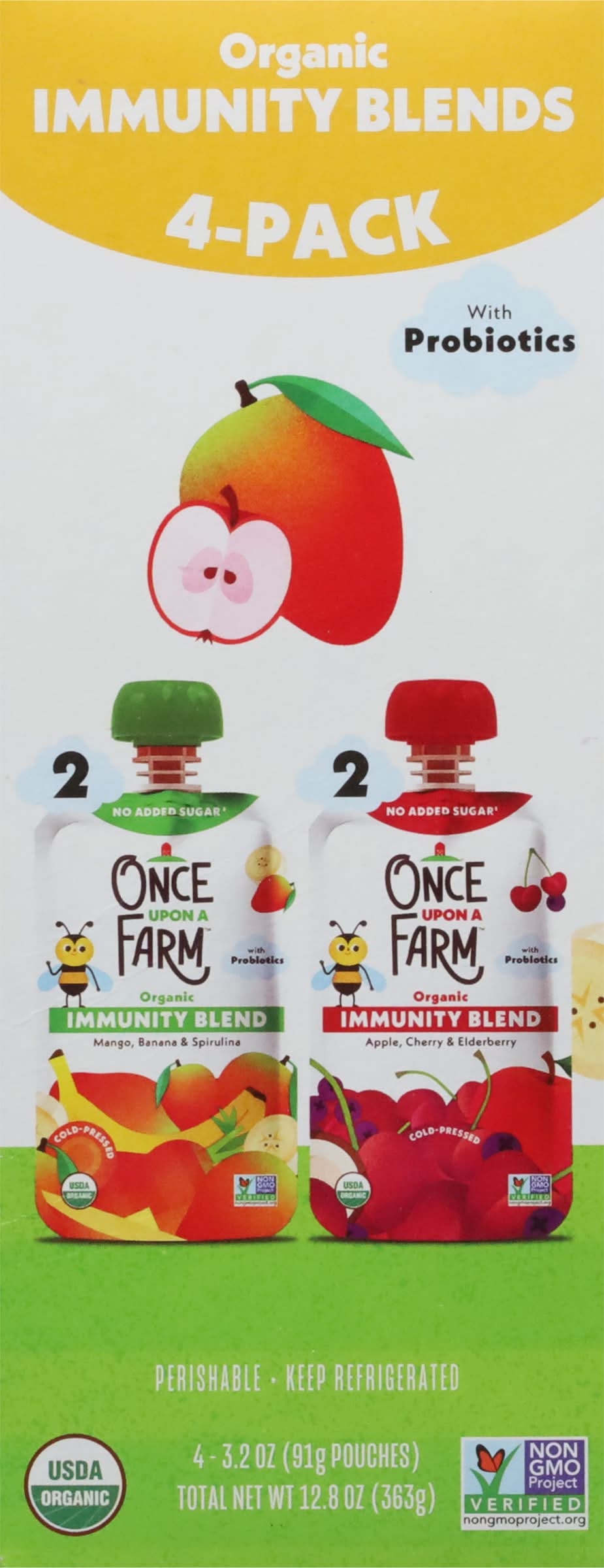 Once Upon a Farm Organic Immunity Blends With Probiotics, Mango-Banana-Spirulina-Apple-Cherry-Elderberry (12.8 oz)