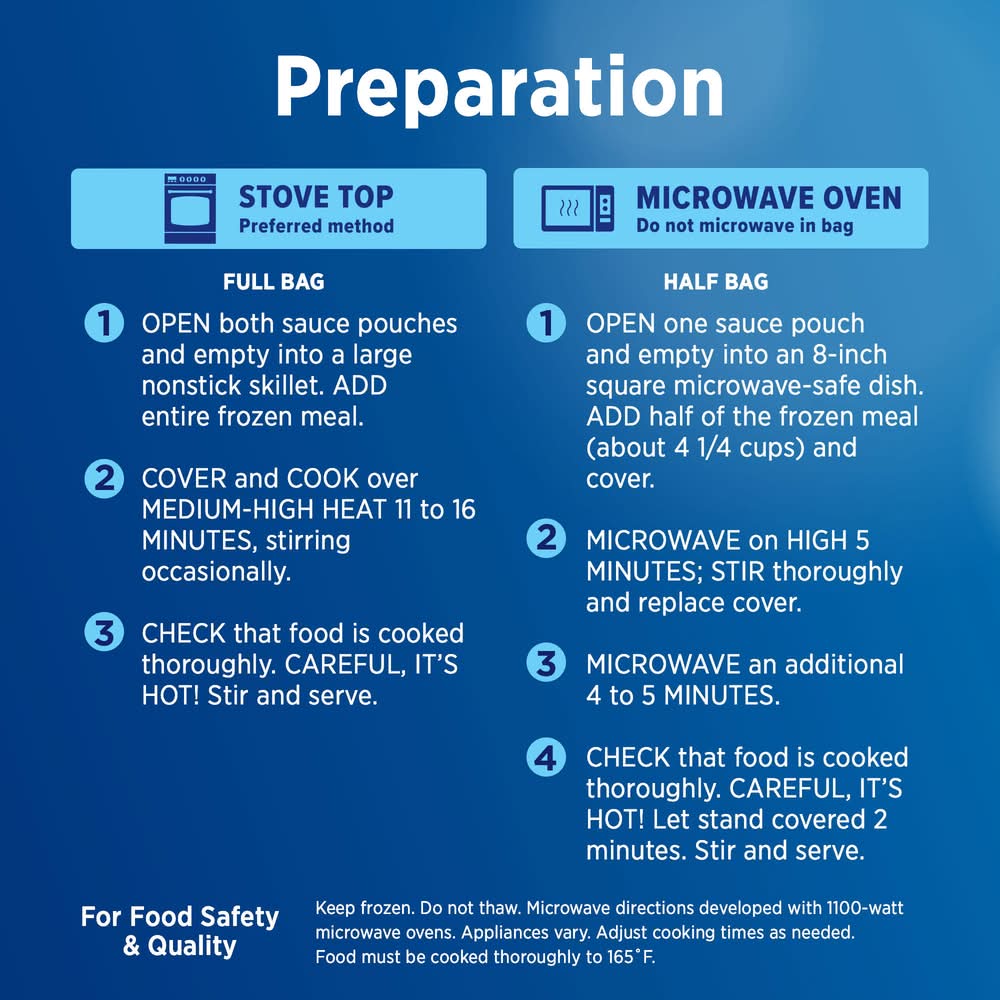 Directions for use: Stove Top - Full Bag: Preferred method. 1. Open both sauce pouches and empty into a large nonstick skillet. Add entire frozen meal. 2. Cover and cook over medium - high heat 11 to 16 minutes, stirring occasionally. 3. Check that food is cooked thoroughly. Careful, it's hot! Stir and serve. Microwave Oven - Half Bag: Do not microwave in bag. 1. Open one sauce pouch and empty into an 8 - inch square microwave -safe dish. Add half of the frozen meal (about 4-1/4 cups) and cover. 2. Microwave on high 5 minutes; stir thoroughly and replace cover. 3. Microwave an additional 4 to 5 minutes. 4. Check that food is cooked thoroughly. Careful, it's hot! Let stand covered 2 minutes. Stir and serve. For Food Safety and Quality: Keep frozen. Do not thaw. Microwave directions developed with 1100 - watt microwave ovens. Appliances vary. Adjust cooking times as needed. Food must be cooked thoroughly to 165 degrees F. Keep frozen; cook thoroughly. Storage recommendation: Keep frozen; cook thoroughly.