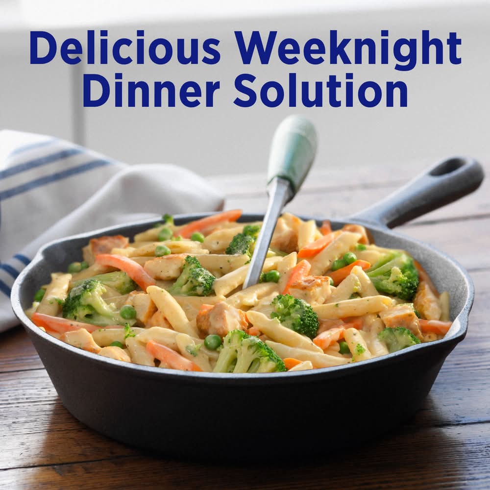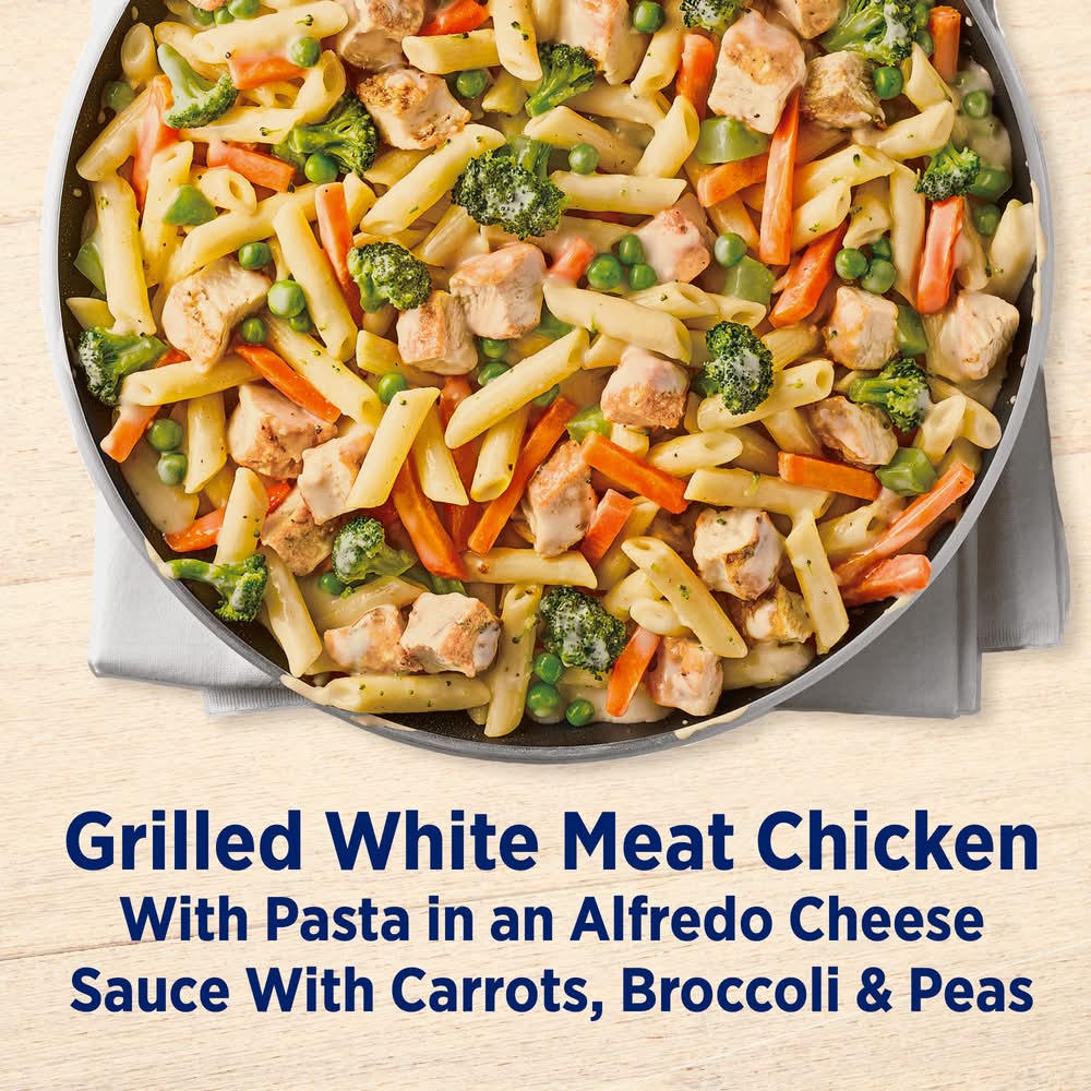 Serve up a delicious meal in minutes with Birds Eye Voila! Alfredo Chicken. With premium Birds Eye vegetables, quality meat and chef-inspired sauces in every bag, Birds Eye Voila! offers complete frozen meals for quick weeknight dinners the whole family will love. This delicious chicken pasta frozen dinner combines white meat chicken, pasta, broccoli, carrots, and peas in a creamy Alfredo sauce for a flavorful meal you can make any night of the week. This Birds Eye pasta dinner with mixed vegetables is made with no artificial flavors and no preservatives for a quick and convenient family dinner solution without compromise. Easily prepare frozen family meals in about 16 minutes on the stove-top or in the microwave. For stove-top preparation, pour sauce pouch and contents of the bag into a skillet with water, stir and simmer until heated through according to package instructions. For even faster preparation, microwave the chicken Alfredo pasta frozen meal according to the package instructions. Store this 42 ounce bag in the freezer to maintain freshness until you are ready to prepare frozen family dinners. It’s good to eat vegetables, so Birds Eye makes vegetables good to eat.
