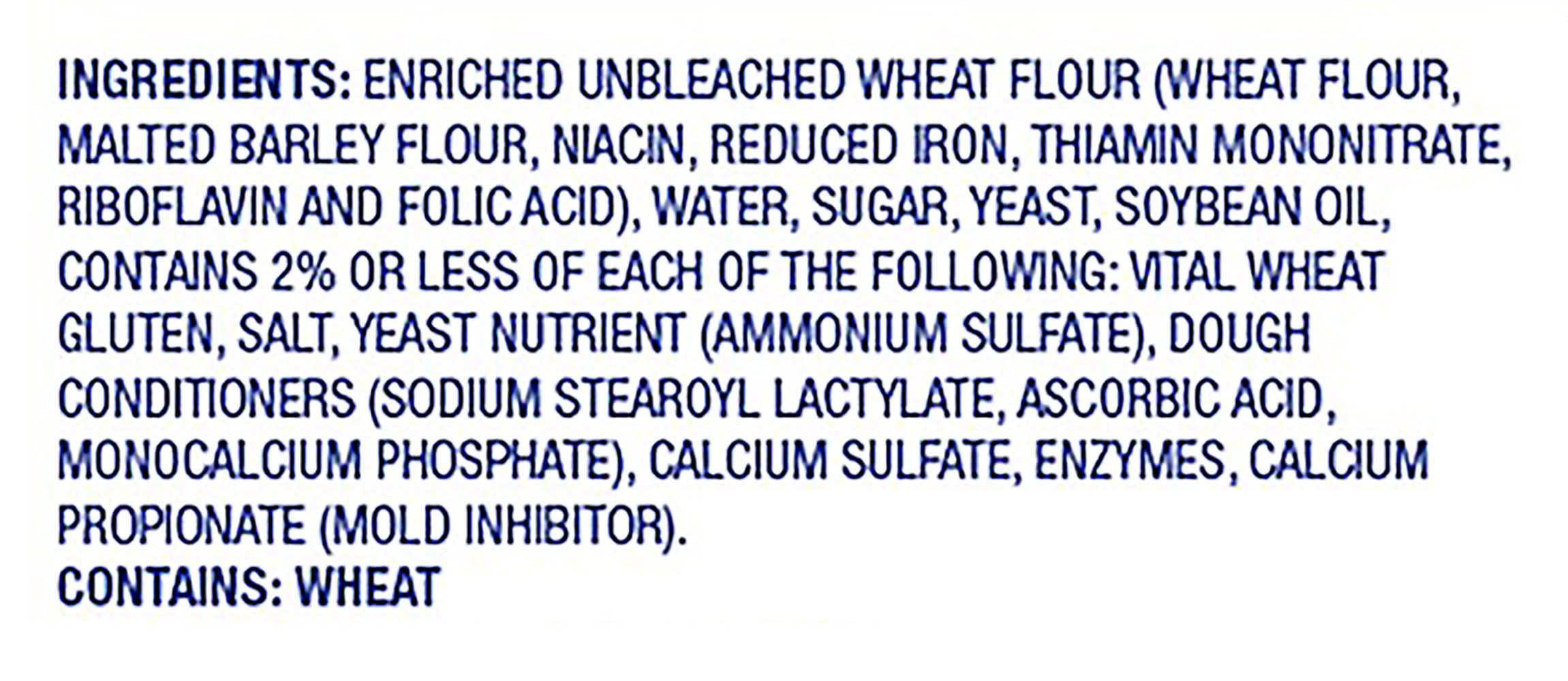 Ingredients: Enriched Unbleached Wheat Flour (Wheat Flour, Malted Barley Flour, Niacin, Reduced Iron, Thiamin Mononitrate, Riboflavin and Folic Acid), Water, Sugar, Yeast, Soybean Oil, Contains 2% or Less of Each of the Following: Vital Wheat Gluten, Salt, Yeast Nutrient (Ammonium Sulfate), Dough Conditioners (Sodium Stearoyl Lactylate, Ascorbic Acid, Monocalcium Phosphate), Calcium Sulfate, Enzymes, Calcium Propionate (Mold Inhibitor) Contains: Wheat, Gluten, Soybeans