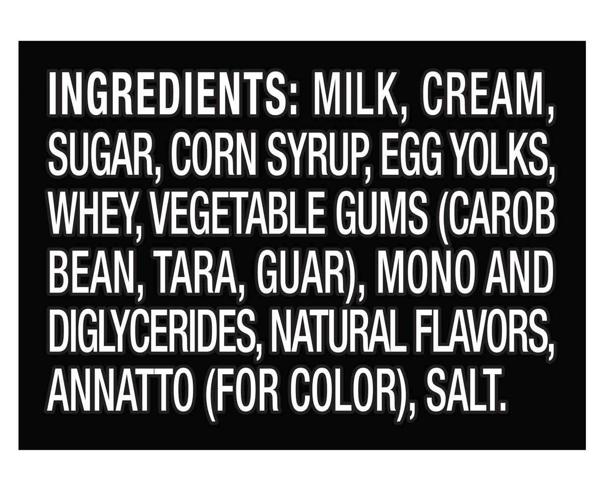 Ingredients: Milk, Cream, Sugar, Corn Syrup, Egg Yolks, Whey, Vegetable Gums Carob Bean, Tara, Guar, Mono and Diglycerides, Natural Flavors, Annatto for Color, Salt. Contains: Milk, Corn Eggs