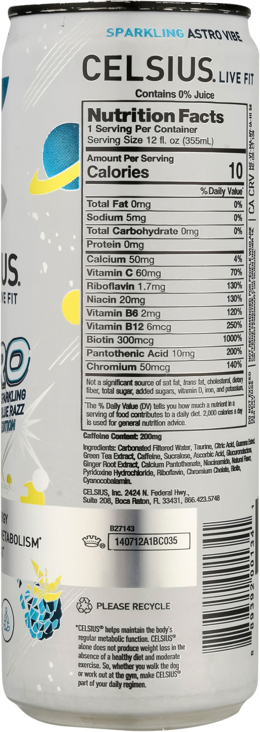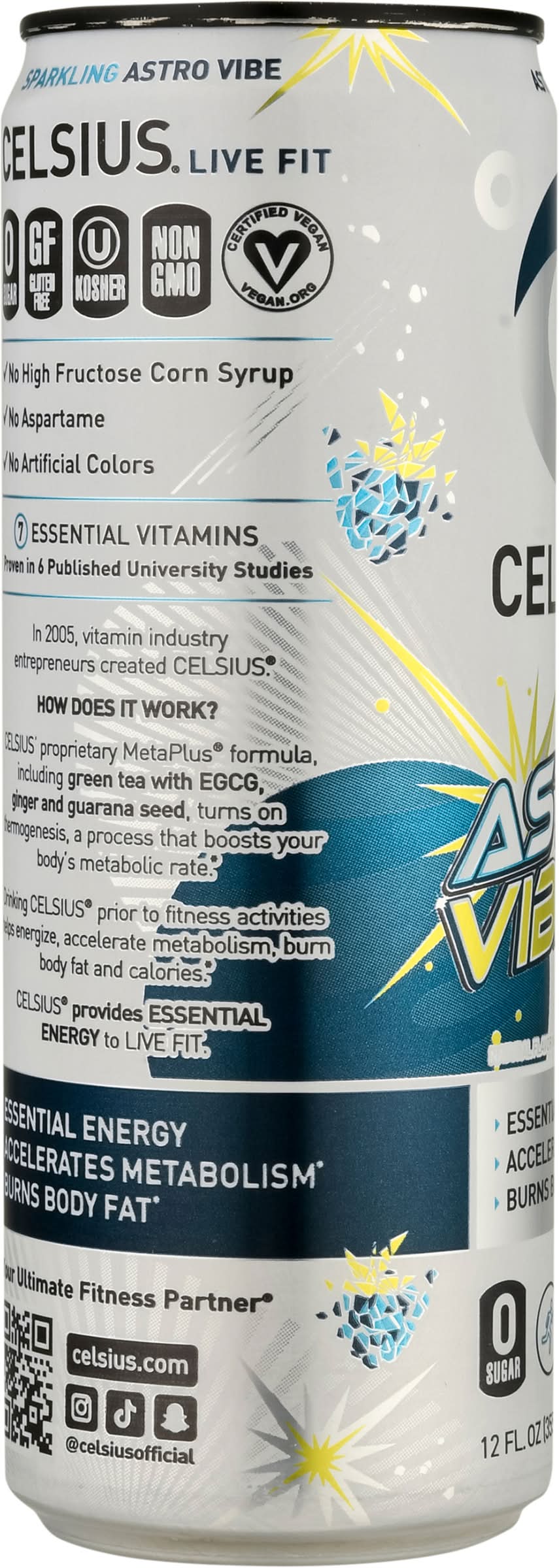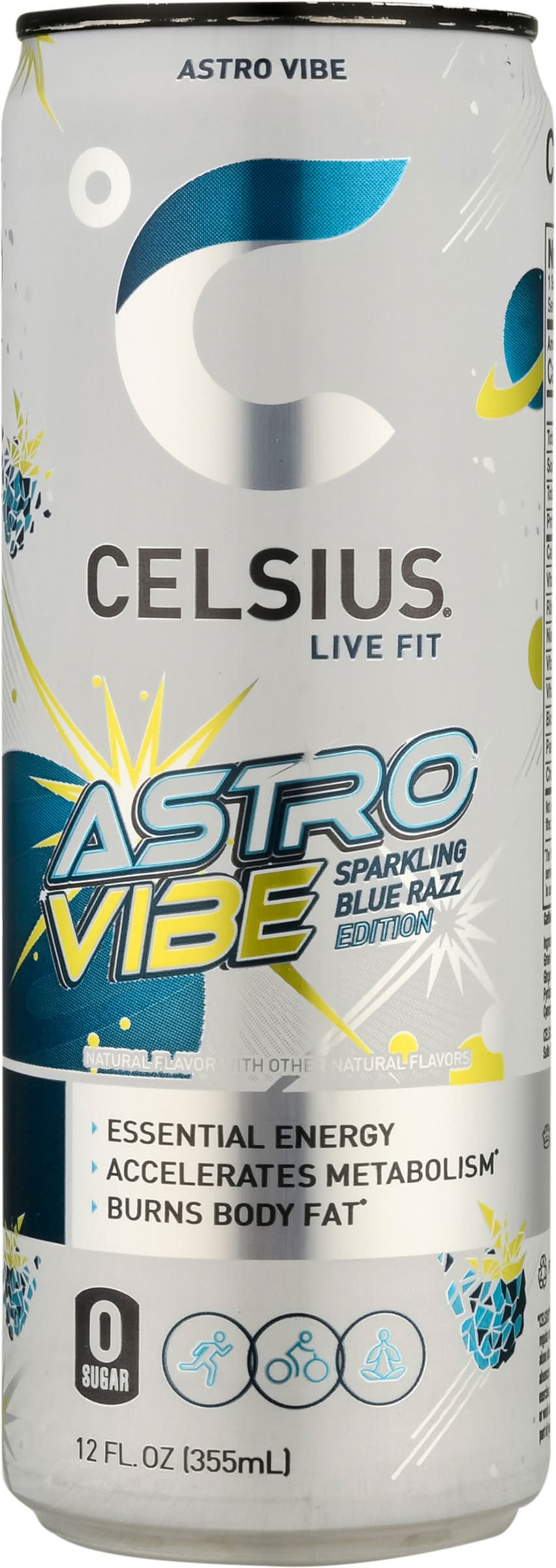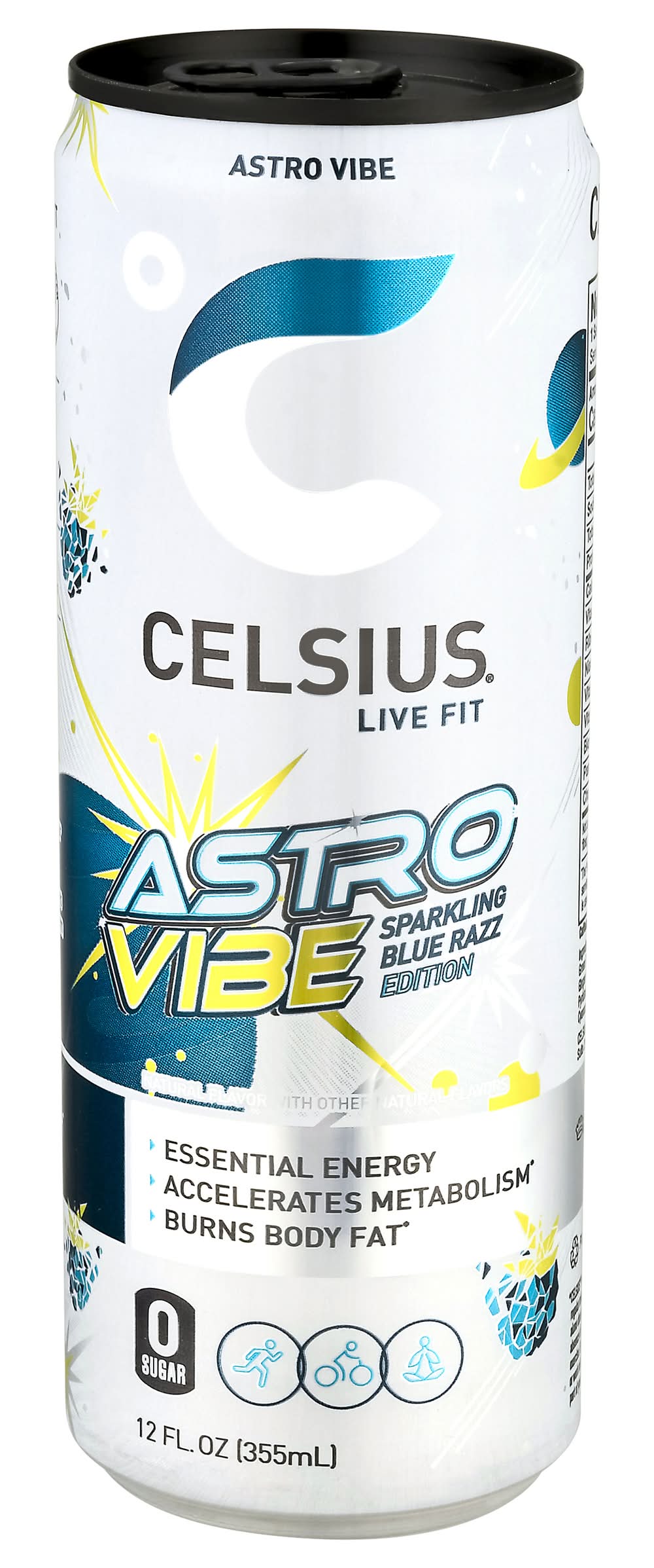 CELSIUS® is functional, Essential Energy, a better-for-you, premium alternative to traditional energy drinks. As a global, lifestyle fitness drink, CELSIUS® was created to help people LIVE FIT, exceed their goals and elevate their everyday lives. Our CELSIUS® VIBE Essential Energy Drinks feature bold flavor combinations that transport you beyond the can to amazing global destinations that inspire us all. From sunny, tropical beaches, to snowy mountainscapes. What’s your vibe? Made with proven, premium ingredients, 7 Essential Vitamins and zero sugar, no artificial colors, no aspartame, no high fructose corn syrup and non-GMO. CELSIUS® is vegan, gluten-free and Kosher. Our proprietary MetaPlus blend contains green tea extract with EGCG. It also includes guarana seed extract, ginger root for flavor and digestion, vitamin C to help support your immune system, vitamin B for energy production, and chromium to help control hunger, making it an ideal pre-workout drink. The new CELSIUS® Astro Vibe is an undoubtedly crowd favorite flavor profile. The Blue Razz indulgent sweetness of blue raspberries flavors and electrifying hues will bring you back to childhood memories of blue-hued tongues during the summer. Inspired by the infinite adventure of space travel, this vibrant can design and successful flavor journey delivers the ultimate refreshing experience. New CELSIUS® Astro Vibe is a fascinating explosion of flavors, it is out of this world! Made with clinically proven ingredients, this carbonated flavor of CELSIUS® has the perfect balance of flavor and energy that serves as an awesome pick-me-up for active lifestyles. Make CELSIUS® your go to choice for Essential Energy! CELSIUS® is available in 12 Fl Oz slim cans and sold in a 12-pack for convenience. • Flavor: Astro vibe • Packaging: Reusable