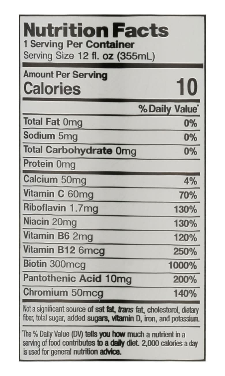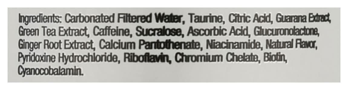 Ingredients: Carbonated Filtered Water, Taurine, Citric Acid, Guarana Extract, Green Tea Extract, Caffeine, Sucralose, Ascorbic Acid, Glucuronolactone, Ginger Root Extract, Calcium Pantothenate, Niacinamide, Natural Flavor, Pyridoxine Hydrochloride, Riboflavin, Chromium Chelate, Biotin, Cyanocobalamin