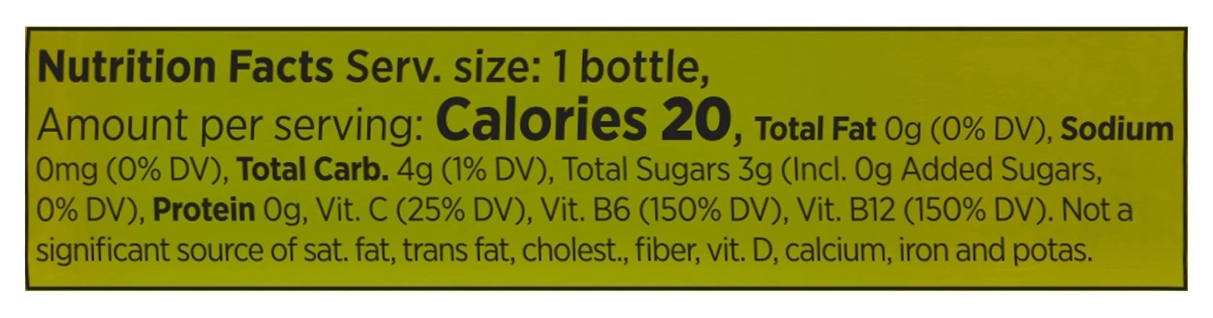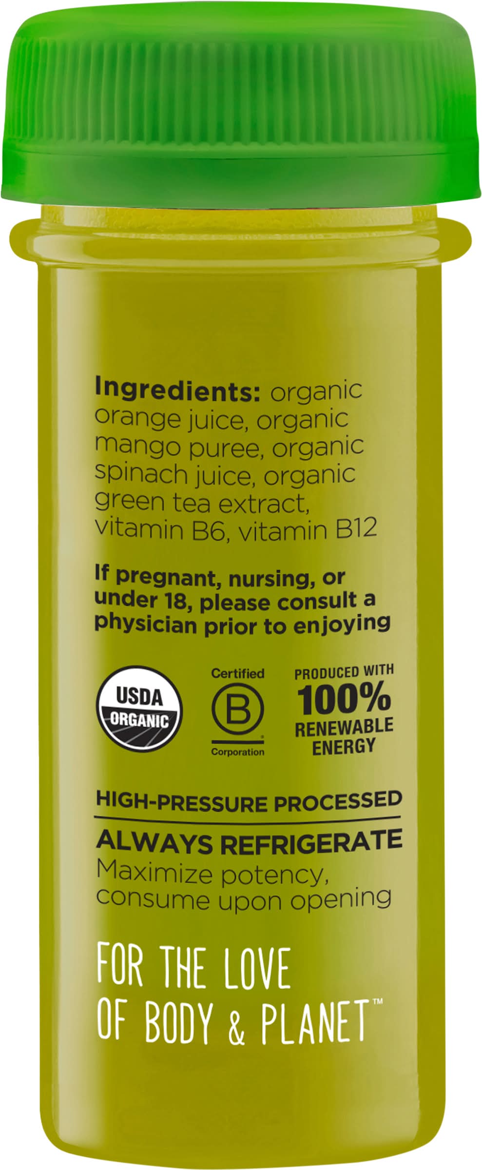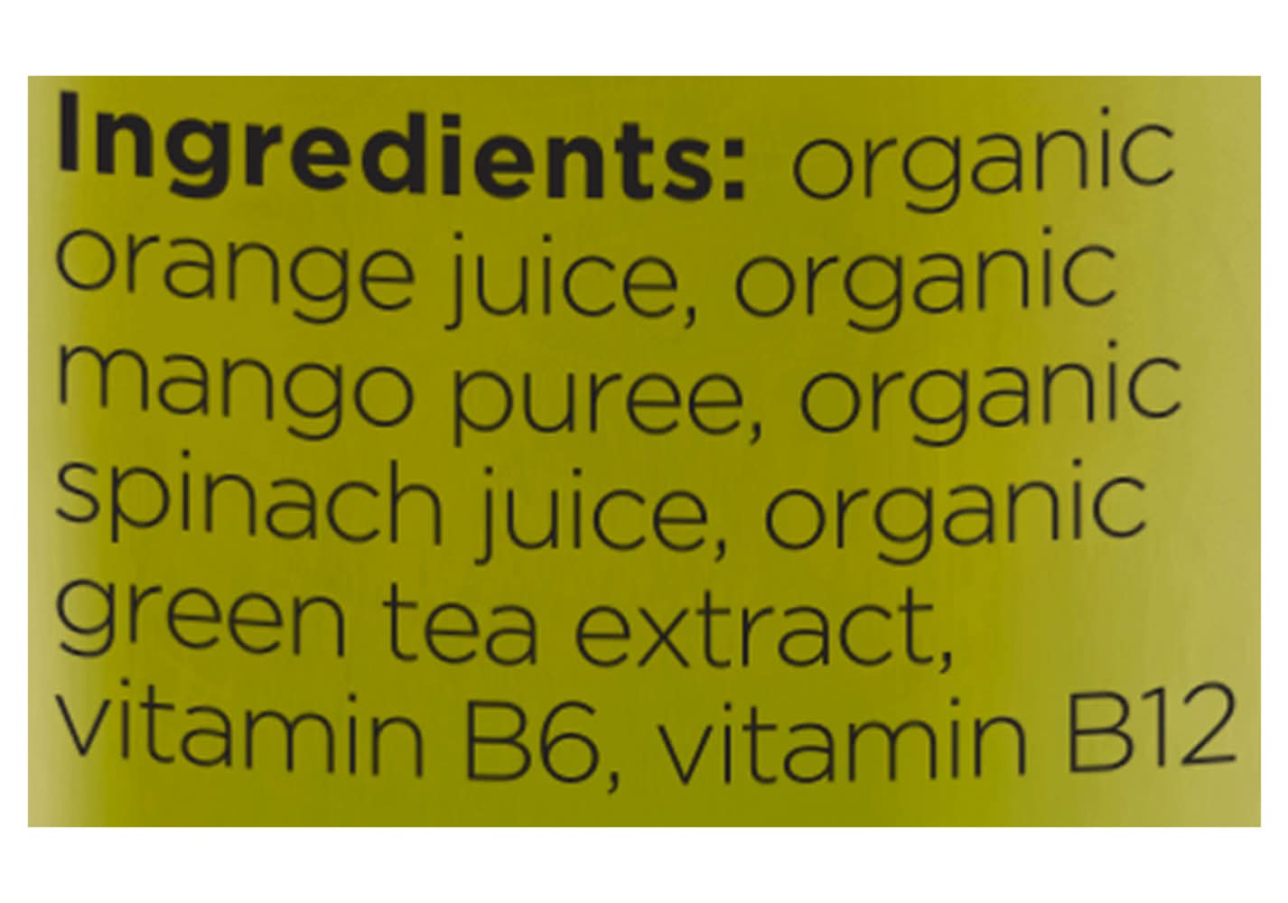 Ingredients: Organic Orange Juice, Organic Mango Puree, Organic Spinach Juice, Organic Green Tea Extract, Vitamin B6, Vitamin B12 Contains 9500mg of caffeine
