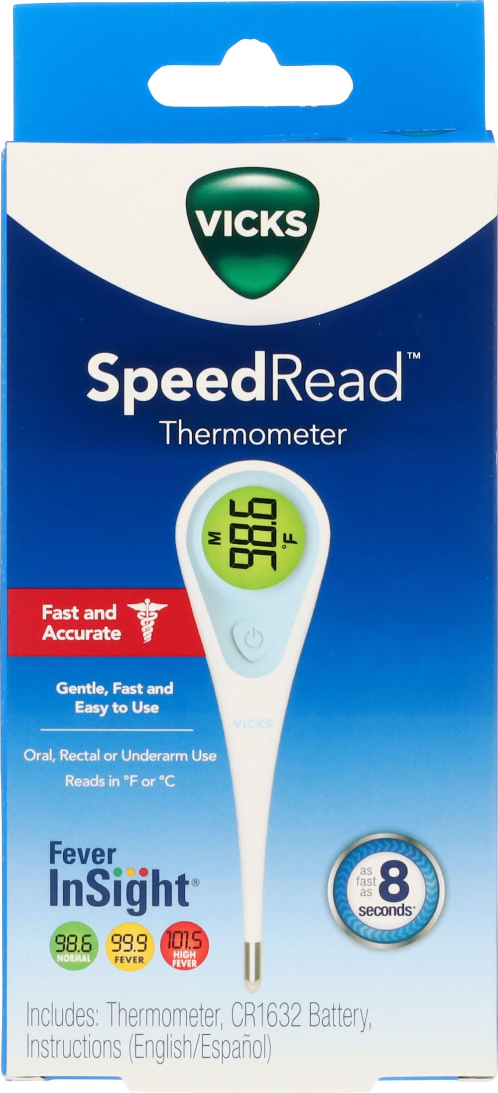 For use orally, rectally, or under the arm. Features: • As fast as 8 second reading Results will vary by individual and method used. Clinical results range from 7 to 38 seconds. Average read times in clinicals: 11 seconds rectal, 15 seconds oral, and 16 seconds underarm. •Aaccurate readings within +/-0.2ºf in laboratory testing • Memory feature: recalls last reading • Not made with BPA • Water resistant • Battery included • Reads in fahrenheit or celsius (ºF or ℃) Fever Insight helps you interpret temperatures by using a color-coded display. A green screen indicates a normal temperature, yellow indicates a fever, and red indicates a high fever. Packaging: Reusable