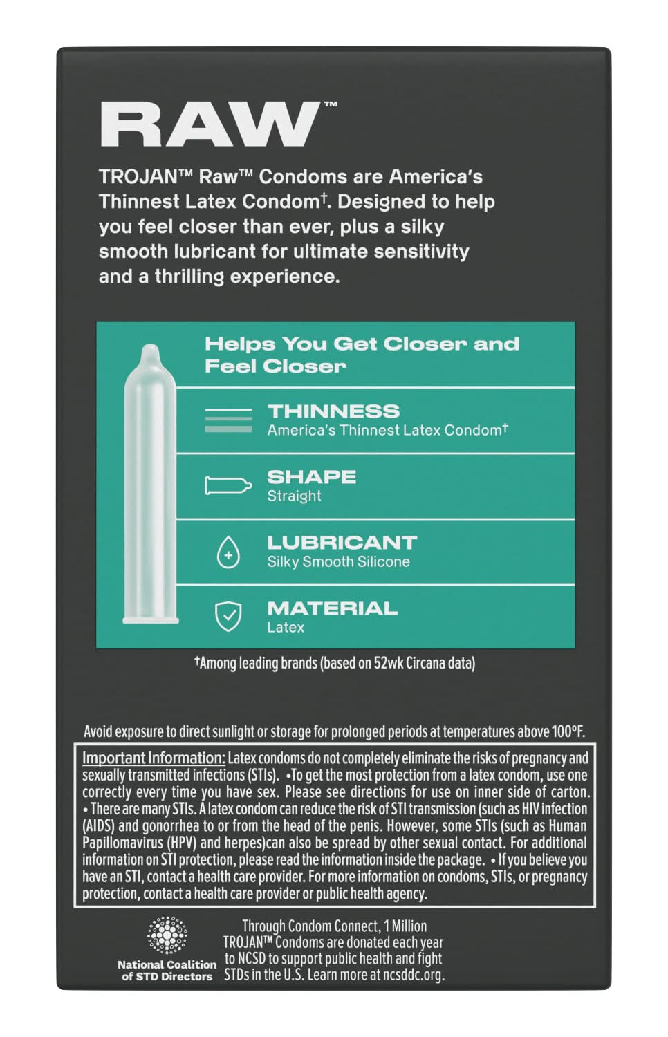 If you want to get closer, look no further than Trojan Bareskin Raw Condoms. These lubricated condoms are America’s thinnest latex condom for men. In our latest innovation of latex condoms, we pulled out all the stops to bring you Bareskin Raw. From the trusted Trojan Brand, these thin condoms can help you enjoy a more natural experience and feel it all. Trojan Brand condoms reduce the risk of unintended pregnancy and sexually transmitted infections (STIs) while you play, and feature a special reservoir end for extra safety. Each box of condoms includes 10 Trojan Bareskin Raw Condoms. Trojan Brand condoms are America's leading condom, trusted for over 100 years. Trojan promotes a safe, healthy, and fun sex life. • Church & Dwight Co., Inc., Ewing, NJ, 08628 • Packaging: Reusable