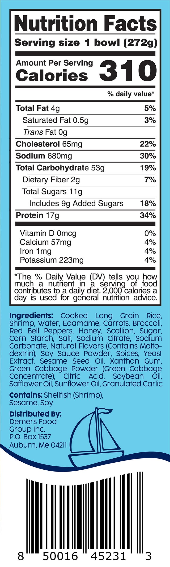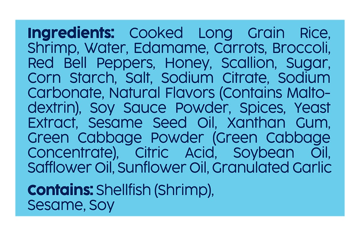 Ingredients: Cooked Long Grain Rice, Shrimp, Water, Edamame, Carrots, Broccoli, Red Bell Peppers, Honey, Scallion, Sugar, Corn Starch, Salt, Sodium Citrate, Sodium Carbonate, Natural Flavors (Contains Maltodextrin), Soy Sauce Powder, Spices, Yeast Extract, Sesame Seed Oil, Xanthan Gum, Green Cabbage Powder (Green Cabbage Concentrate), Citric Acid, Soybean Oil, Safflower Oil, Sunflower Oil, Granulated Garlic Contains: Sesame, Crustacean Shellfish, Shrimp, Soybeans, Wheat, Corn