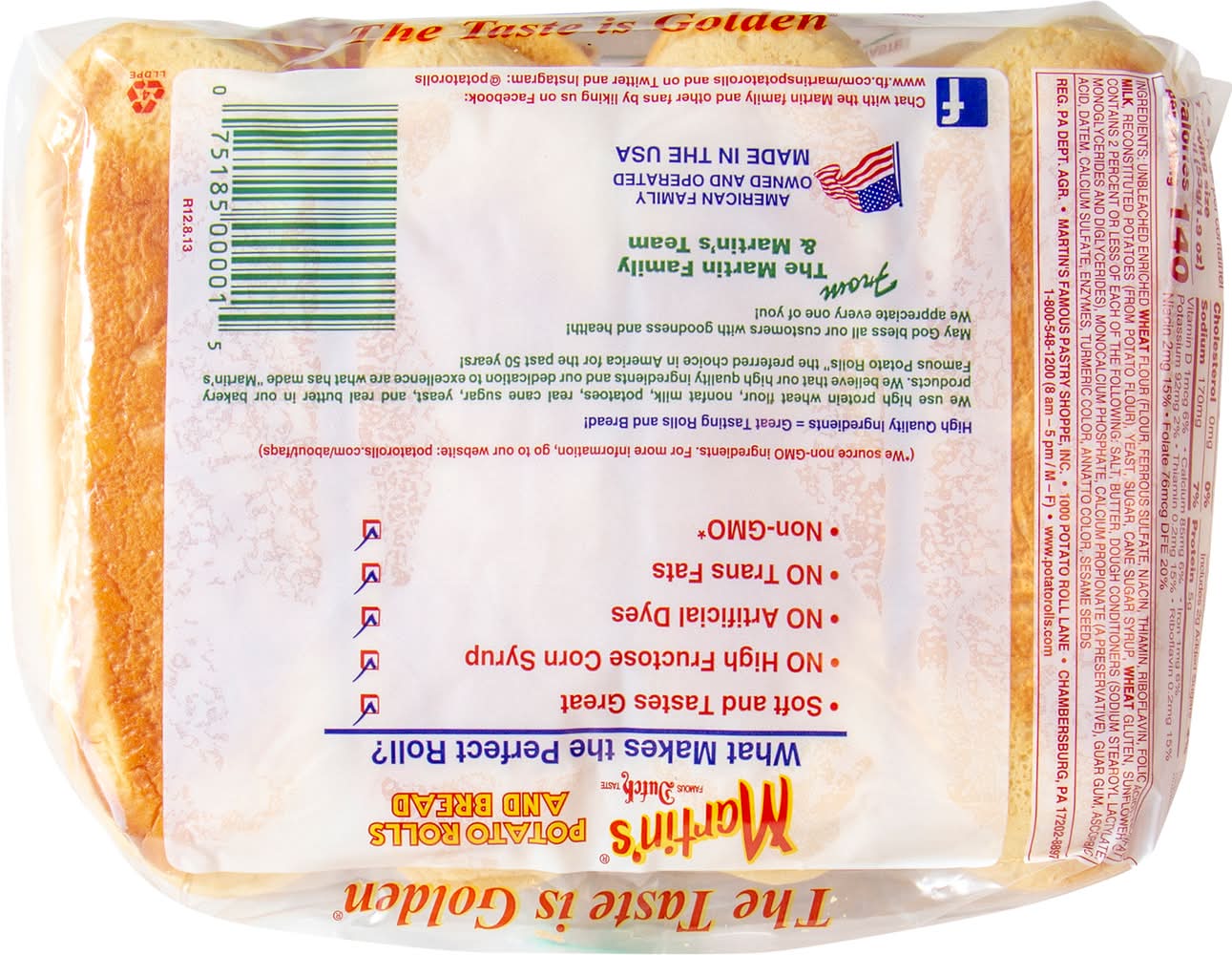The taste is golden. Potato rolls and bread. What makes the perfect rolls? Soft and taste great. High quality ingredients = Great tasting rolls and bread! We use high protein wheat flour, nonfat milk, potatoes, real cane sugar, yeast, and real butter in our bakery products. We believe that our high quality ingredients and our dedication to excellence are what has made Martin's famous potato rolls the preferred choice in America for the past 50 years! May God bless all our customers with goodness and health! We appreciate every one of you! From The Martin Family & Martin's Team. American family owned and operated. Delicious to serve at the nicest dinner. Maximum flavor our home receipe. Made in the USA. • Martin's Famous Pastry Shoppe, Inc., 1000 Potato Roll Lane, Chambersburg, PA, 17202-8897 • Packaging: Reusable