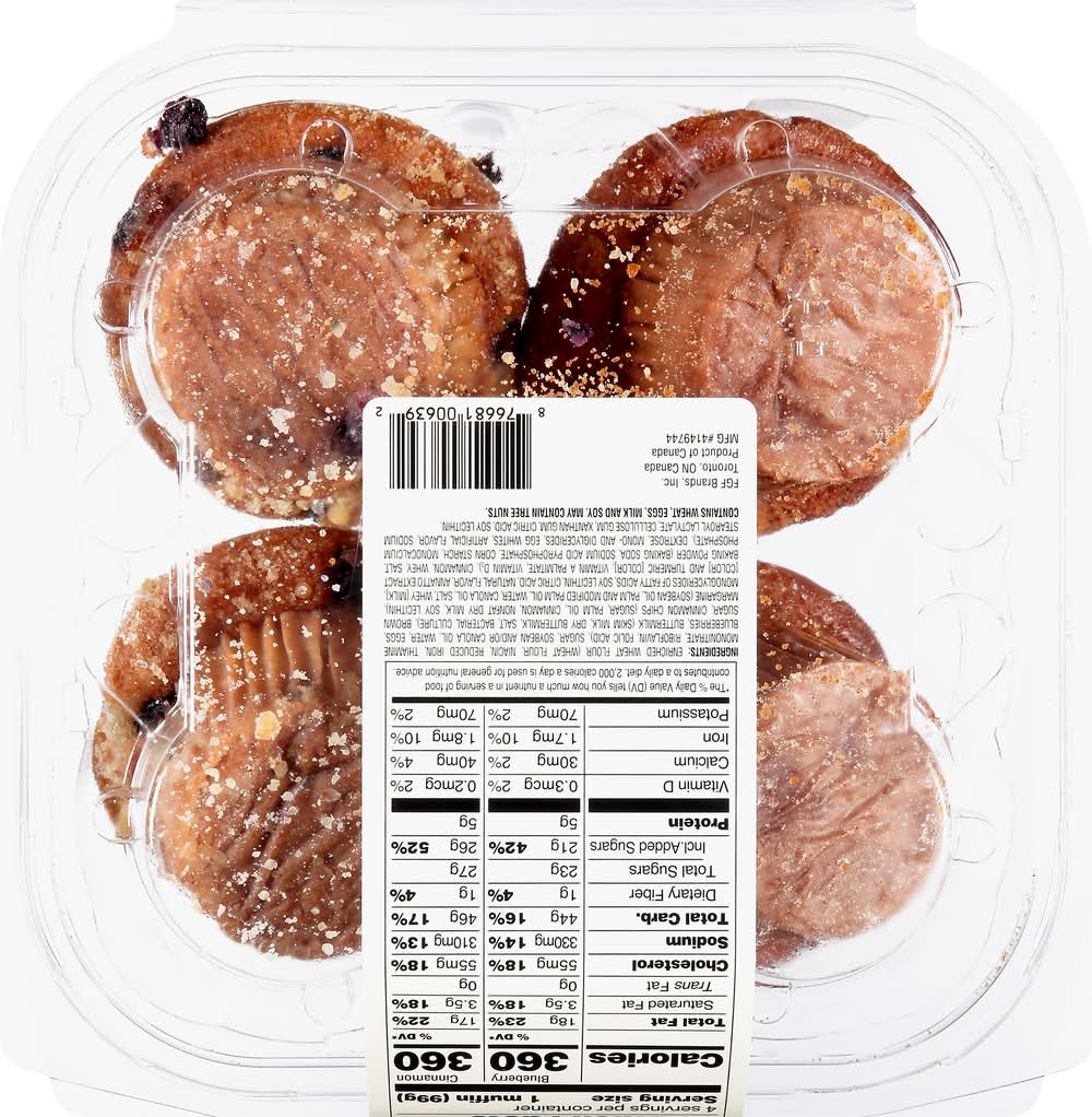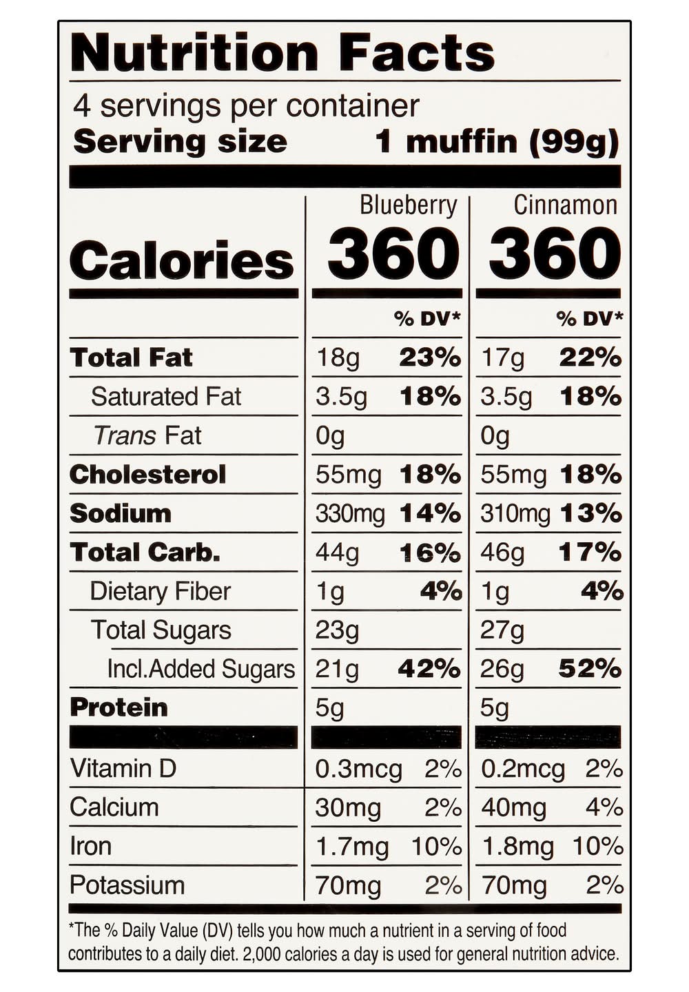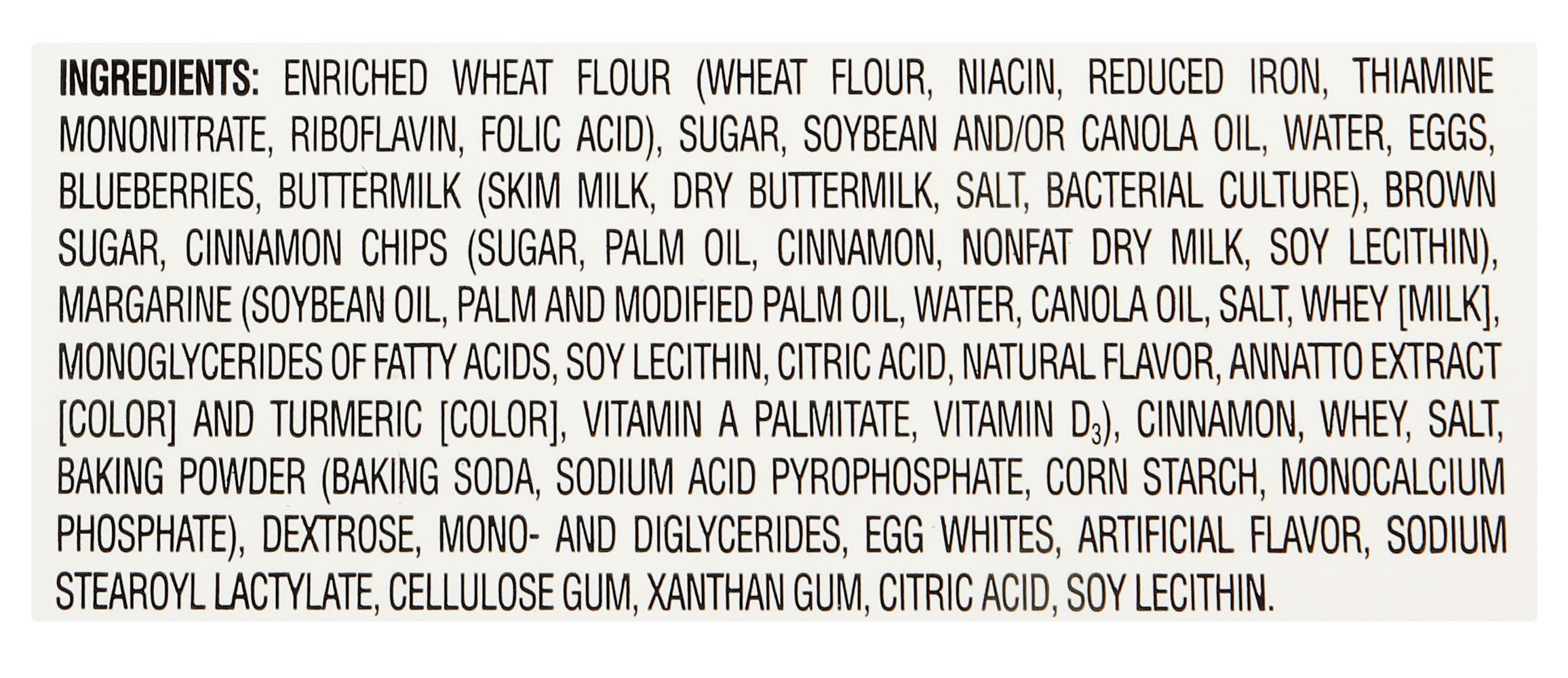 Ingredients: Enriched Wheat Flour (Wheat Flour, Niacin, Reduced Iron, Thiamine Mononitrate, Riboflavin, Folic Acid), Sugar, Soybean and/or Canola Oil, Water, Eggs, Blueberries, Buttermilk (Skim Milk, Dry Buttermilk, Salt, Bacterial Culture), Brown Sugar, Cinnamon Chips (Sugar, Palm Oil, Cinnamon, Nonfat Dry Milk, Soy Lecithin), Margarine (Soybean Oil, Palm and Modified Palm Oil, Water, Canola Oil, Salt, Whey [Milk], Monoglycerides of Fatty Acids, Soy Lecithin, Citric Acid, Natural Flavor, Annatto Extract [Color] and Turmeric [Color], Vitamin A Palmitate, Vitamin D3), Cinnamon, Whey, Salt, Baking Powder (Baking Soda, Sodium Acid Pyrophosphate, Corn Starch, Monocalcium Phosphate), Dextrose, Mono- and Diglycerides, Egg Whites, Artificial Flavor, Sodium Stearoyl Lactylate, Cellulose Gum, Xanthan Gum, Citric Acid, Soy Lecithin Contains: Wheat, Eggs, Milk, Soybeans, Tree Nuts