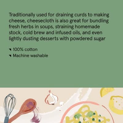 This is the handy kitchen helper you didn’t know you needed. Traditionally used for draining curds to making cheese, this cotton cheesecloth is also great for bundling fresh herbs in soups, straining homemade stock, cold brew and infused oils, and even lightly dusting desserts with powdered sugar. Use it to bring out your inner chef, then simply toss it in the washer when it needs a refresh. • Color: Off white • Size: 36x36 in