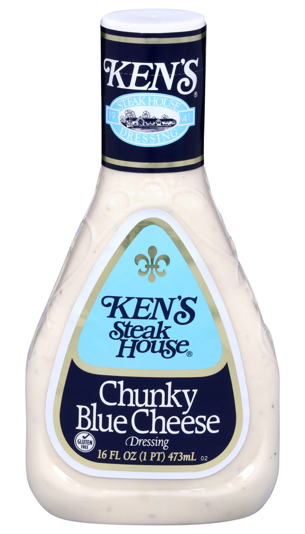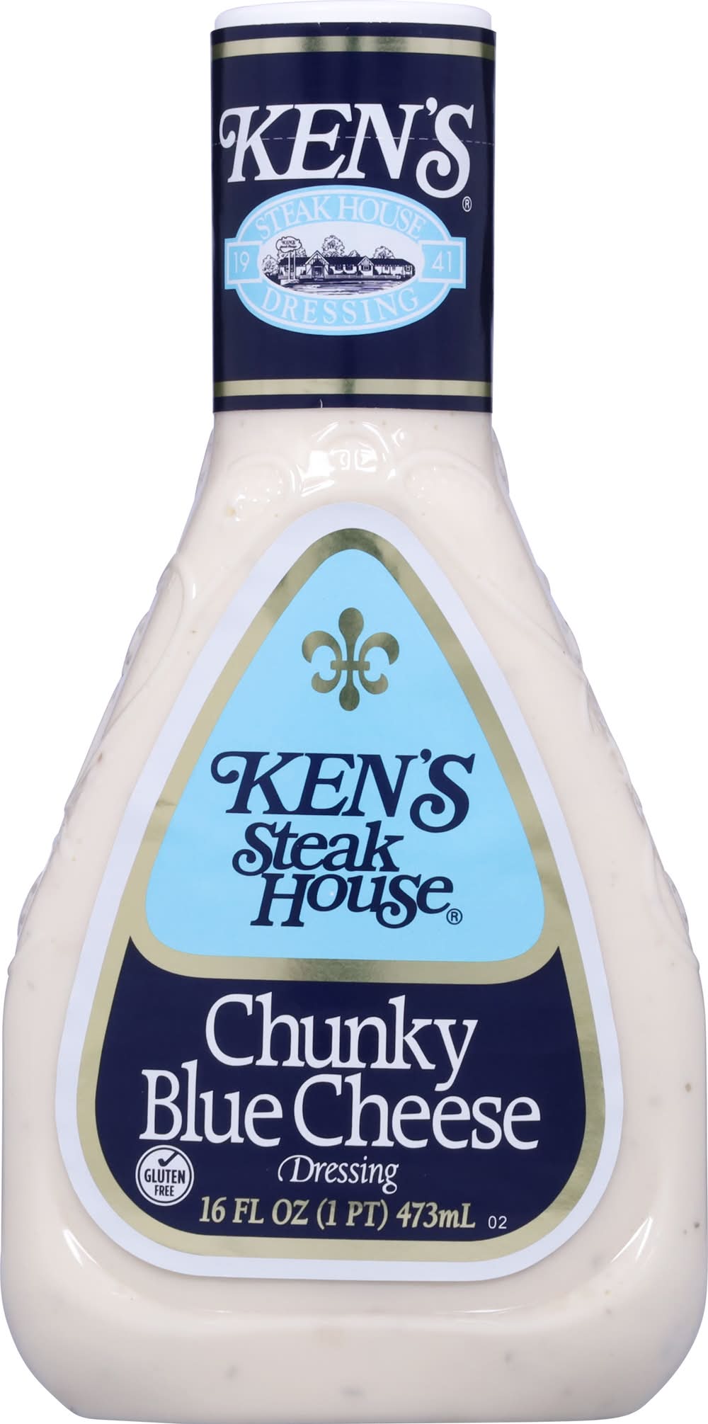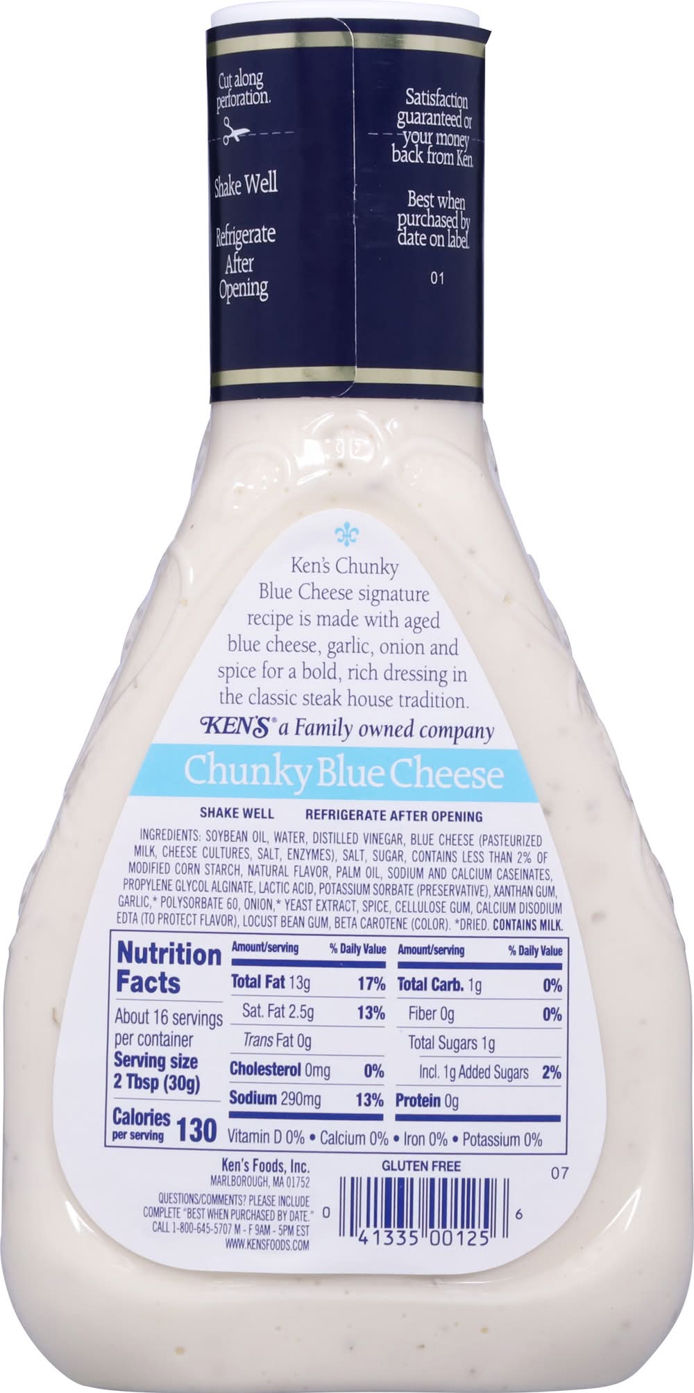 Ken's Steak House Chunky Blue Cheese Dressing has a big, classic blue cheese taste that could only come from big chunks of real blue cheese. A must for every fridge. Pour it over a wedge of cold lettuce for a salad course that can't be beat. Spread it on sandwiches. Dress up a burger. Use it as a gluten-free dip for fresh, crunchy veggies. Making wings? Be sure to get an extra bottle. Shake well before use and refrigerate after opening. Ken's Foods, Inc., Marlborough, MA, 01752