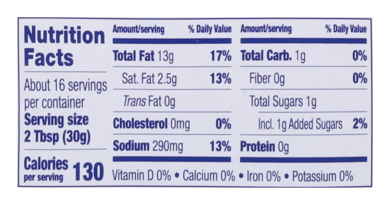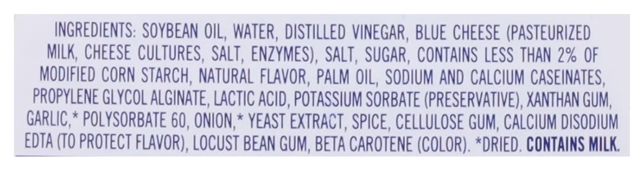 Ingredients: Soybean Oil, Water, Distilled Vinegar, Blue Cheese (Pasteurized Milk, Cheese Cultures, Salt, Enzymes), Salt, Sugar, Contains Less than 2% of Modified Corn Starch, Natural Flavor, Palm Oil, Sodium and Calcium Caseinates, Propylene Glycol Alginate, Lactic Acid, Potassium Sorbate (Preservative), Xanthan Gum, Garlic*, Polysorbate 60, Onion*, Yeast Extract, Spice, Cellulose Gum, Calcium Disodium EDTA (to Protect Flavor), Locust Bean Gum, Beta Carotene (Color). * Dried Contains: Milk