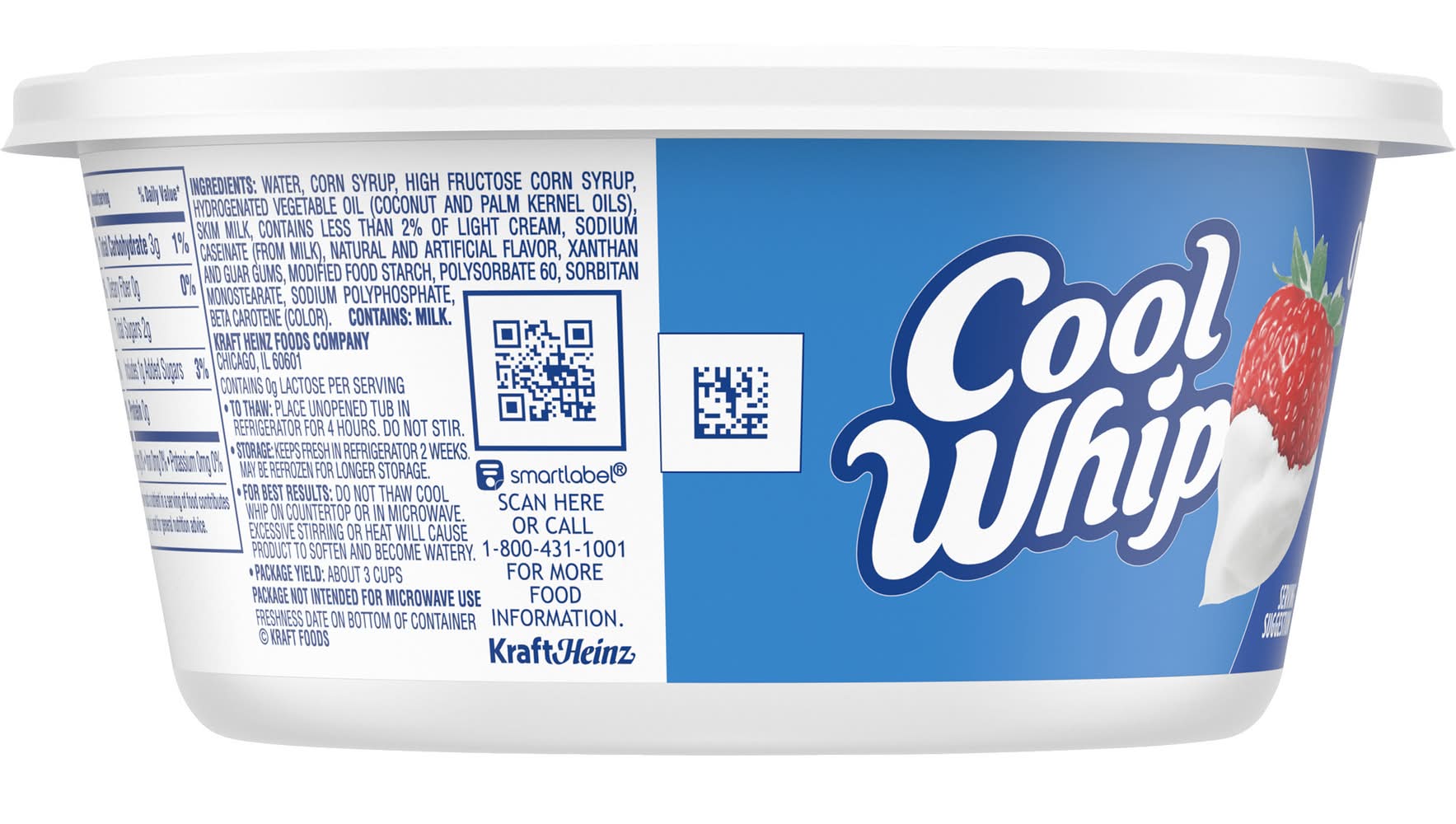 Directions for use: To thaw place unopened tub in refrigerator for 4 hours. Do not stir. For best results do not thaw cool whip on countertop or in microwave. Excessive stirring or heat will cause product to soften and become watery. Storage recommendation: Keep fresh in refrigerator 2 weeks. May refrozen for longer storage.