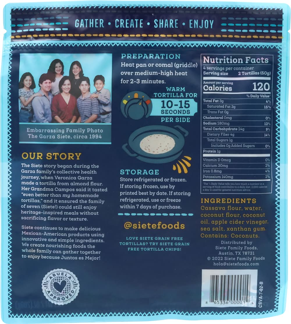 Paleo. Dairy free. Soy free. Vegan. Certified Gluten-Free. This product is free from wheat, corn, rice, eggs, dairy, and soy. Made in a dedicated gluten-free facility. Grain free. Non GMO. Non GMO Project verified. nongmoproject.org. Gather. Create. Share. Enjoy. Embarrassing Family Photo The Garza Siete, circa 1990. The Siete Story: In 2009, all seven (siete) members of the Garza family began exercising together and adopted a grain free diet to support Veronica, their sister and daughter, who was diagnosed with multiple health conditions. Going grain free meant that this third-generation Mexican-American family from South Texas could no longer eat many of their favorite foods. So, Veronica began to create grain free dishes her whole family could enjoy. When their Grandma Campos said that Veronica's first creation, a grain almond flour tortilla, tasted better than her own homemade flour tortillas, the family realized they had something special.I Love Siete grain free tortillas? Try Siete Grain Free Tortilla Chips! Siete Family Foods, Austin, TX, 78731