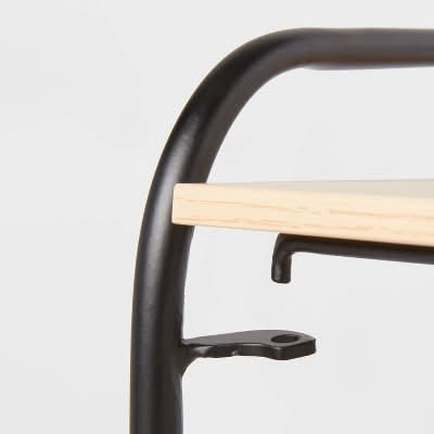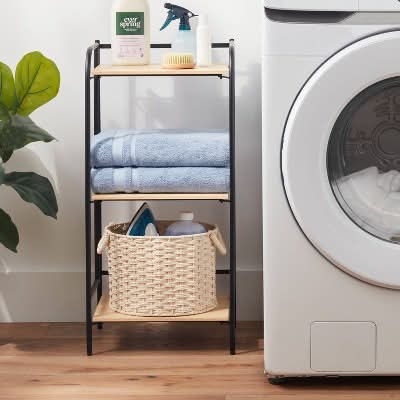Organize your cleaning and bath essentials with this Folding 3-Shelf Black Metal with Natural Wood Shelves from Brightroom. This shelf for storage is set on a black metal frame that complements the wooden shelves for modern style that works well in a variety of spaces and decor styles. Multiple open shelves provide enough space for your items and easy access to them. With the foldable design, this metal and wood shelf is easy to move and store when not in use. Brightroom. See your space in a new light. Foldable, Storage Organizer, Powder-Coated Finish