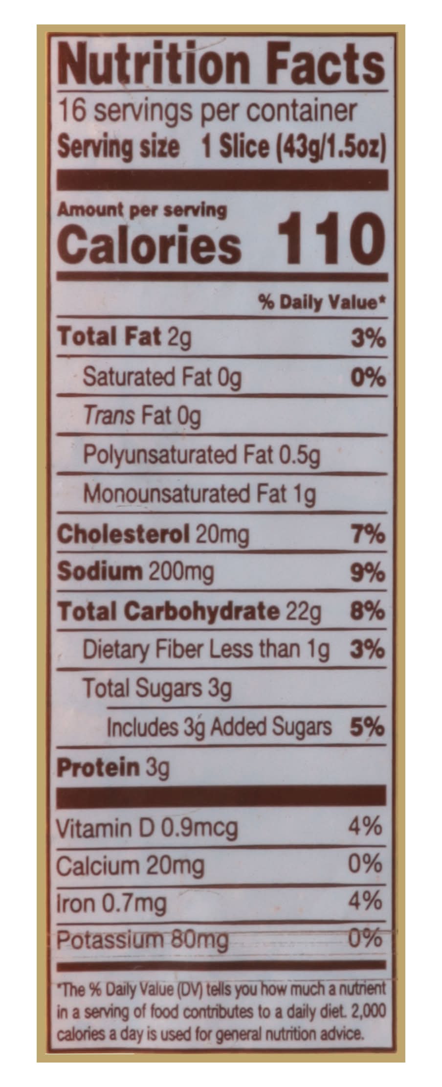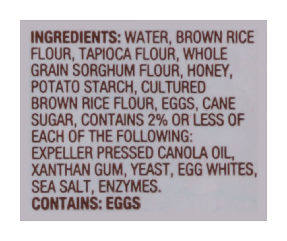 Ingredients: Water, Brown Rice Flour, Tapioca Flour, Whole Grain Sorghum Flour, Honey, Potato Starch, Cultured Brown Rice Flour, Eggs, Cane Sugar, Contains 2% or Less of Each of the Following: Expeller Pressed Canola Oil, Xanthan Gum, Yeast, Egg Whites, Sea Salt, Enzymes Contains: Eggs