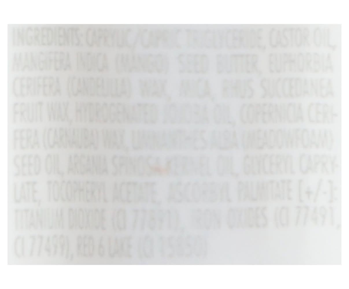 Ingredients: Caprylic/Capric Triglycerides, Castor Oil, Mangifera Indica (Mango) Seed Butter, Euphorbia Cerifera (Candelilla) Wax, Mica, Rhus Succedanea Fruit Wax, Hydrogenated Jojoba Oil, Copernicia Cerifera (Carnauba) Wax, Limnanthes Alba (Meadowfoam) Seed Oil, Argania Spinosa Kernel Oil, Glyceryl Caprylate, Tocopheryl Acetate, Ascorbyl Palmitate [+/-]: Titanium Dioxide (CI 777891), Iron Oxides (CI 77491, CI 77499), Red 6 Lake (CI 75850) Contains: Tree Nuts, Argan Nuts