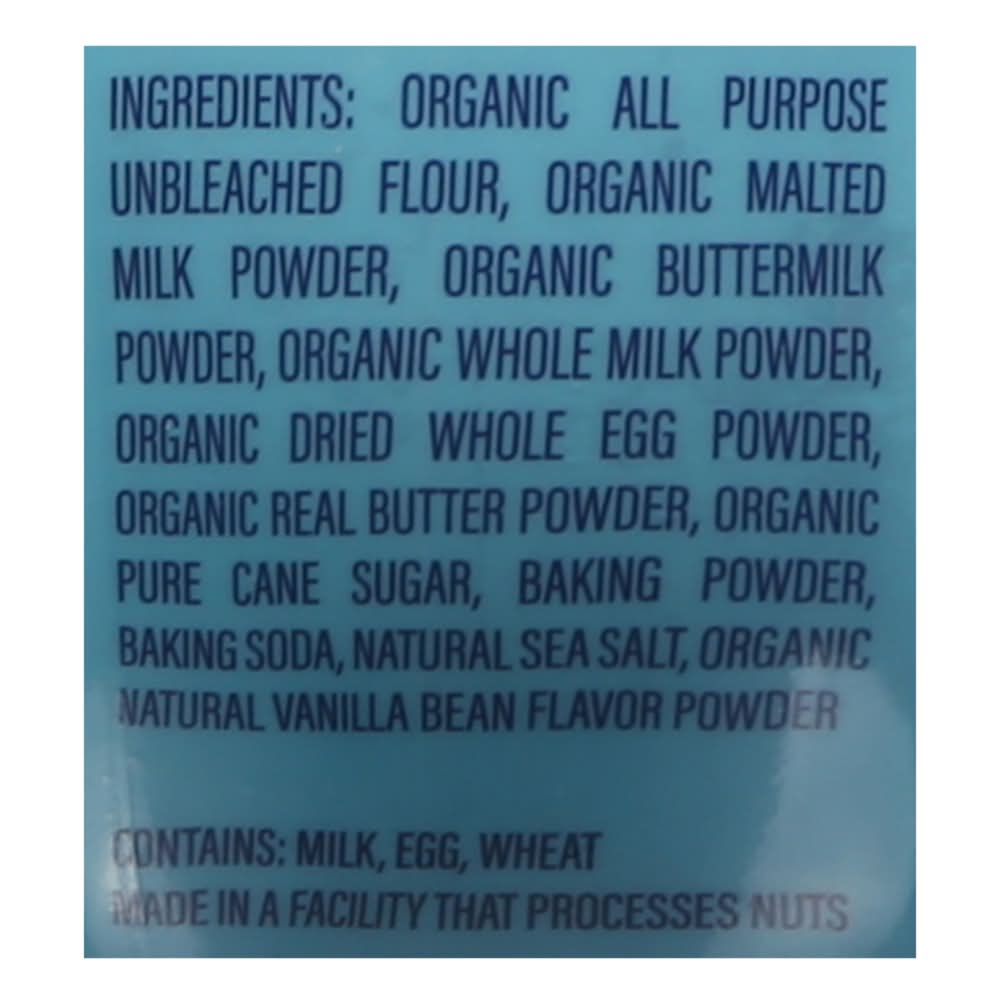 Ingredients: Organic All Purpose Unbleached Flour, Organic Malted Milk Powder, Organic Buttermilk Powder, Organic Whole Milk Powder, Organic Dried Whole Egg Powder, Organic Real Butter Powder, Organic Pure Cane Sugar, Baking Powder, Baking Soda, Natural Sea Salt, Organic Natural Vanilla Bean Flavor Powder Contains: Eggs, Milk, Wheat, Tree Nuts