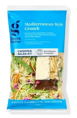 This Mediterranean Crunch from Good & Gather™ has everything you need to whip up an elevated, vibrant, and refreshing salad that is great for a side dish at get-togethers, family dinners, or casual lunches. The fun kit includes escarole, endive, broccoli stalk, cauliflower, feta cheese, crispy flatbread strips, radicchio, carrots, and red cabbage, finished with a bright basil balsamic vinaigrette. There are no artificial preservatives, flavors, or synthetic colors — just toss and serve for the quick, perfect blend of flavor and convenience. Every product that carries the Good & Gather™ name starts with quality ingredients that deliver great taste, making it easier for you and your family to eat well, every day. We promise you’ll love each bite, or your money back. All Good & Gather products are made without artificial flavors, synthetic colors, artificial sweeteners, and high-fructose corn syrup. Some are specially formulated while others never contained these ingredients.