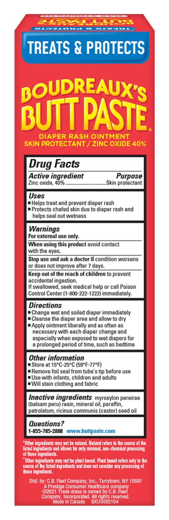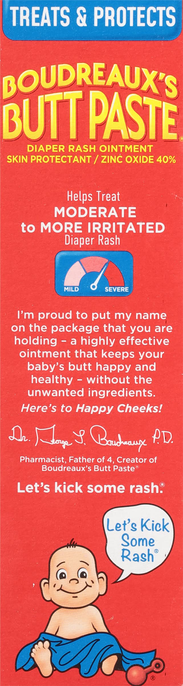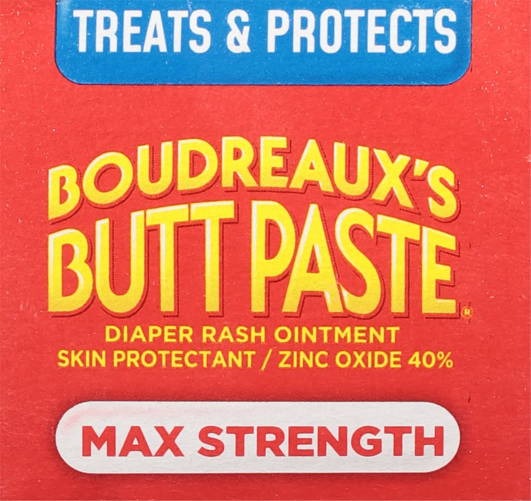 Boudreaux's Butt Paste Maximum Strength Diaper Rash Ointment is developed by a pharmacist and designed to be effective yet gentle on babies' skin. Containing the highest level of zinc oxide available over-the-counter, it provides overnight protection and starts to soothe on contact. This ointment seals out moisture to help keep the skin dry and is ideal for the daily prevention and treatment of moderate to more irritated diaper rash. It is free from dyes, preservatives, parabens, and talc, making it suitable for use with infants, children, and adults. Note that it may stain clothing and fabric.