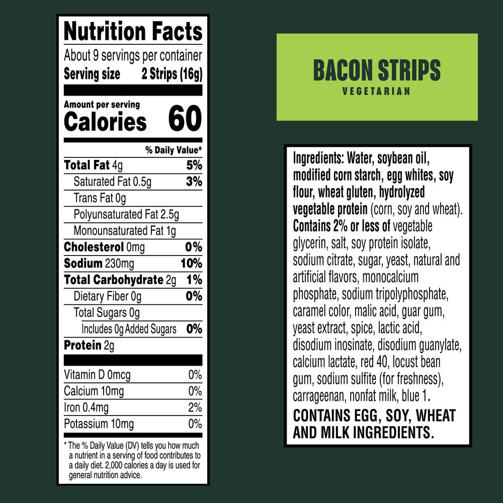 Are vegetarian and feature a delicious taste in every bite. Easy to prepare for a part of a tasty breakfast, each bacon strip is made with high quality ingredients. At 60 calories per serving, pair these savory veggie bacon strips with your favorite cup of coffee or tea. And with 39% less fat than cooked pork bacon, MorningStar Farms veggie bacon strips are an excellent choice for a balanced breakfast and are ready to eat in just 2 minutes; This convenient, hearty breakfast side will delight everyone in your family. Whip up a breakfast scramble, a short stack of pancakes, or savory sandwich or wrap. Try them in a breakfast sandwich or crumble bacon to create an omelet for a quick breakfast. Kellogg Sales, Battle Creek, MI, 49016