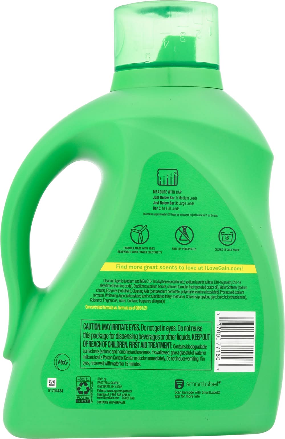 78 Loads (Contains approximately 78 loads as measured to just below bar 1 on the cap). Fresh laundry for 26 weeks (based on an average 3 loads per week). Febreze freshness. For all HE machines. Free of phosphates. Cleans in cold water. Concentrated formula Contains no phosphate. Packaging: Reusable