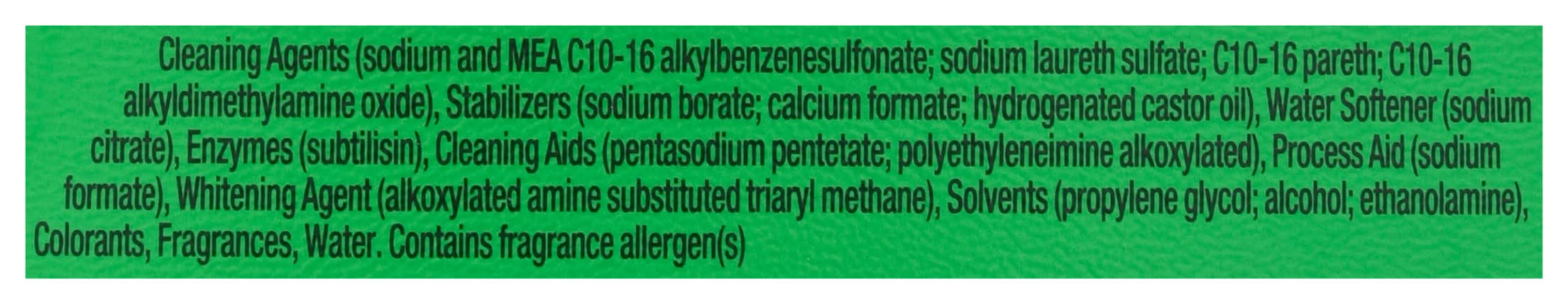 Ingredients: Cleaning Agents (Sodium and MEA C10-16 Alkylbenzenesulfonate, Sodium Laureth Sulfate, C10-16 Pareth, C10-16 Alkyldimethylamine Oxide), Stabilizers (Sodium Borate, Calcium Formate, Hydrogenated Castor Oil), Water Softener (Sodium Citrate), Enzymes (Subtilisin), Cleaning Aids (Pentasodium Pentetate, Polyethyleneimine Alkoxylated), Process Aid (Sodium Formate), Whitening Agent (Alkoxylated Amine Substituted Triaryl Methane), Solvents (Propylene Glycol, Alcohol, Ethanolamine), Colorants, Fragrances, Water