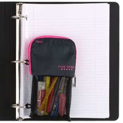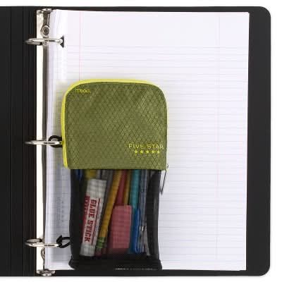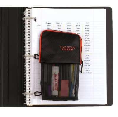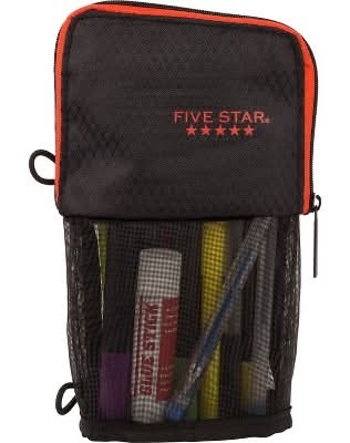 LASTS ALL YEAR. GUARANTEED! Five Star Stand 'N Store self-standing pencil pouch will keep your pens, pencils and more in one convenient place. The unique 4 1/2" x 8" self-standing design makes everything easier to access and prevents items from falling out, plus it can be conveniently stored in a 3-ring binder. The Stand 'N Store has interior pockets to give you additional storage and durable, puncture resistant micro-mesh to let you quickly see what’s inside. Color chosen for you. Color: Assorted
