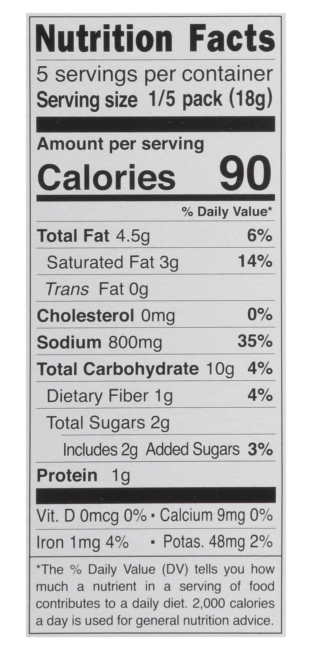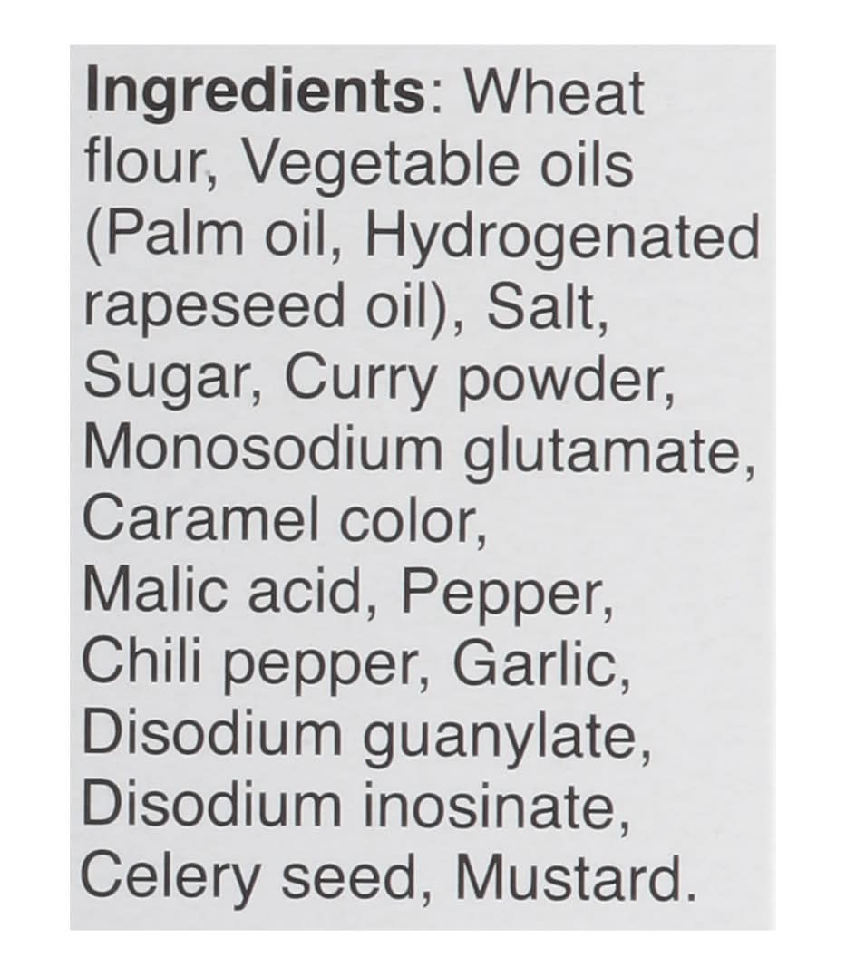 Ingredients: Wheat Flour, Vegetable Oils (Palm Oil, Hydrogenated Rapeseed Oil), Salt, Sugar, Curry Powder, Monosodium Glutamate, Caramel Color, Malic Acid, Pepper, Chili Pepper, Garlic, Disodium Guanylate, Disodium Inosinate, Celery Seed, Mustard Contains: Celery, Wheat, Mustard