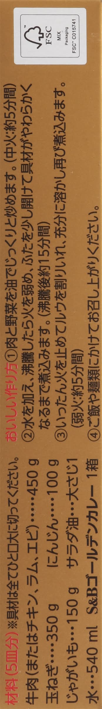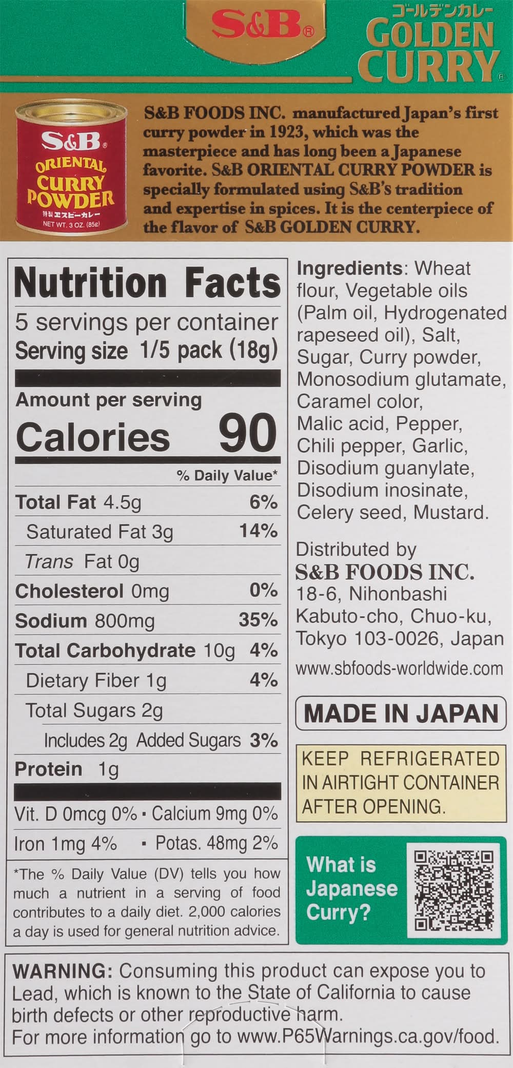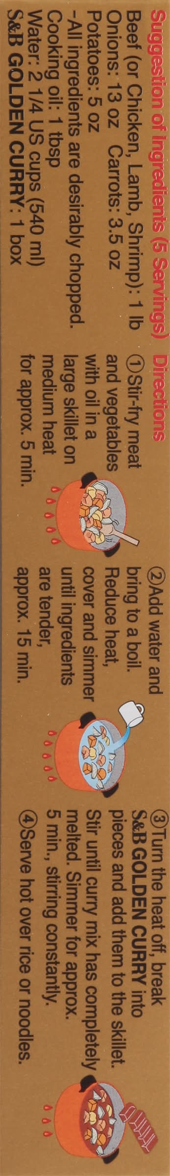 Directions for use: Directions: 1. Stir-fry meat and vegetables with oil in a large skillet on medium heat for approx. 5 min. 2. Add water and bring to a boil. Reduce heat, cover and simmer until ingredients are tender, approx. 15 min. 3. Turn the heat off, break S&B Golden Curry into pieces and add them to the skillet. Stir until sauce mixes are completely melted. Simmer approx. 5 min., stirring constantly. 4. Serve hot over rice or noodles. Suggestion of Ingredients (5 Servings) Beef (or Chicken, Lamb, Shrimp) : 1 lb. Onions: 13 oz. Carrots: 3.5 oz. Potatoes: 5 oz. Cooking oil: 1 tbsp. Water: 2 1/4 US cups (540 ml). S&B Golden Curry: 1 box. (All ingredients are desirably chopped.) Keep refrigerated in airtight container after opening. Storage recommendation: Keep refrigerated in airtight container after opening.
